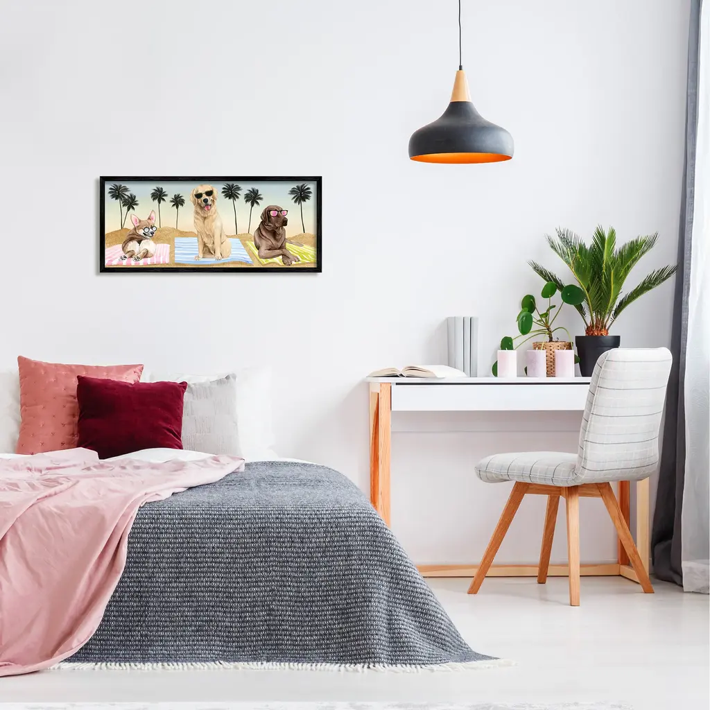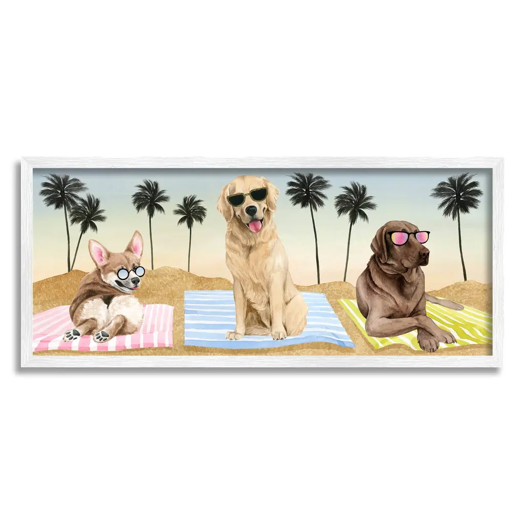 Stupell Whimsical Dogs Sunglasses Beach Towels Palm Trees Framed Wall Art - Multi-Color - 30 X 13 - White
