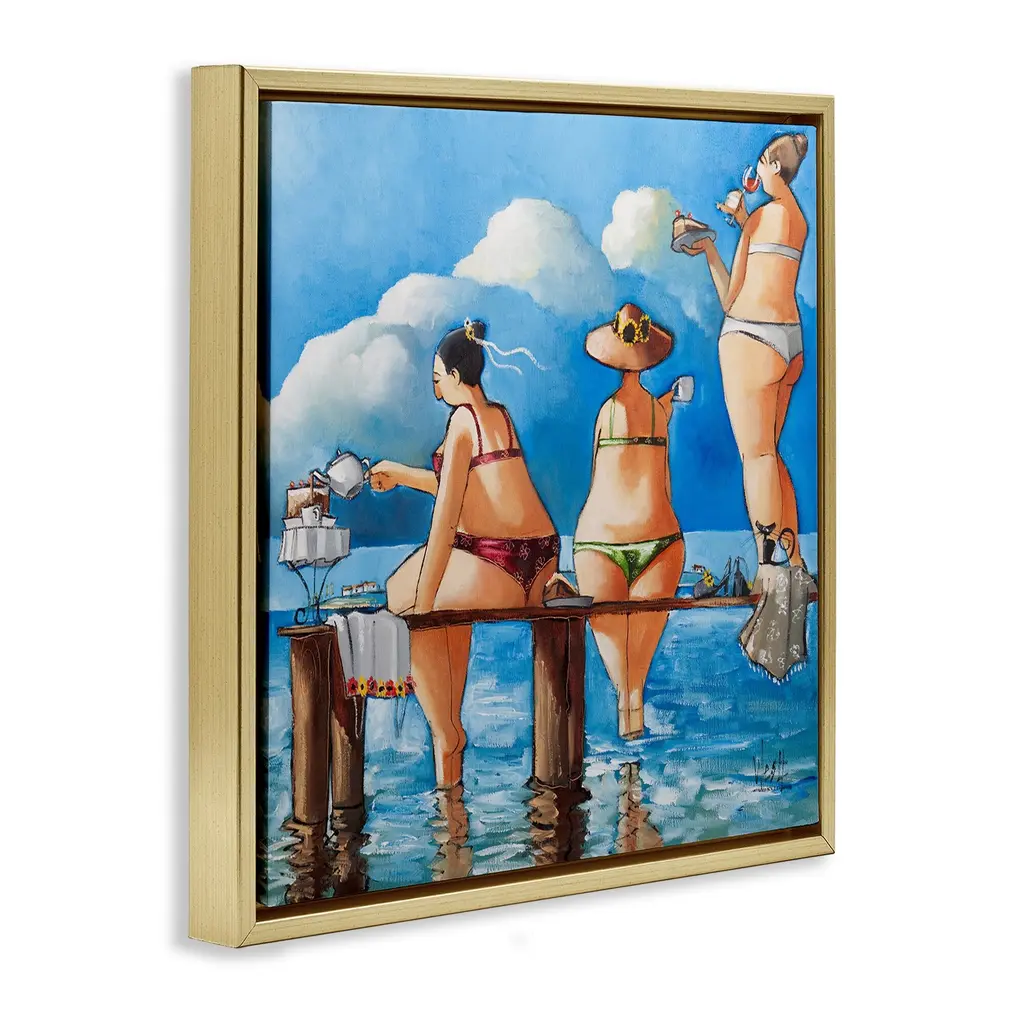 Elevate your home or office to the next level with Stupell Framed Floating Canvas Wall Art. Our premium hand-stretched canvas is mounted securely into a sturdy lightweight frame. The museum-style gap between the wrapped canvas and the box frame gives the illusion of floating artwork. Stupell Wall Art is made in the USA.Features: Dimensions: 18 x 1.7 x 18 Frame, 17 x 1.5 x 17 Canvas ArtFloating Frame Canvas Products are available in sizes 18"x18" and 25"x25". All Floating Frame Canvas Products have a 1.7" Depth.Wall Art is Ready to Hang with Hardware Free Hanging. No Installation required. For Easy Set Up Lean or Layer Artwork on Shelf or Against Wall. Artwork is Permently Fixed into the Frame.Our elevated 1.7" Thick Floating Frame is the perfect complement to our canvas style Wall Art. We use only the highest quality inks in house with industry leading printing solutions. Canvas is hand stretched over a durable wood foundation and then mounted securly into a Modern Box Frame. Made in the USA.Artwork Relates To: Person, Woman, Painting, Swimwear, Water, Waterfront, Leisure Activities, Beach, Water, Ocean, CoastDesign by Ronald West
