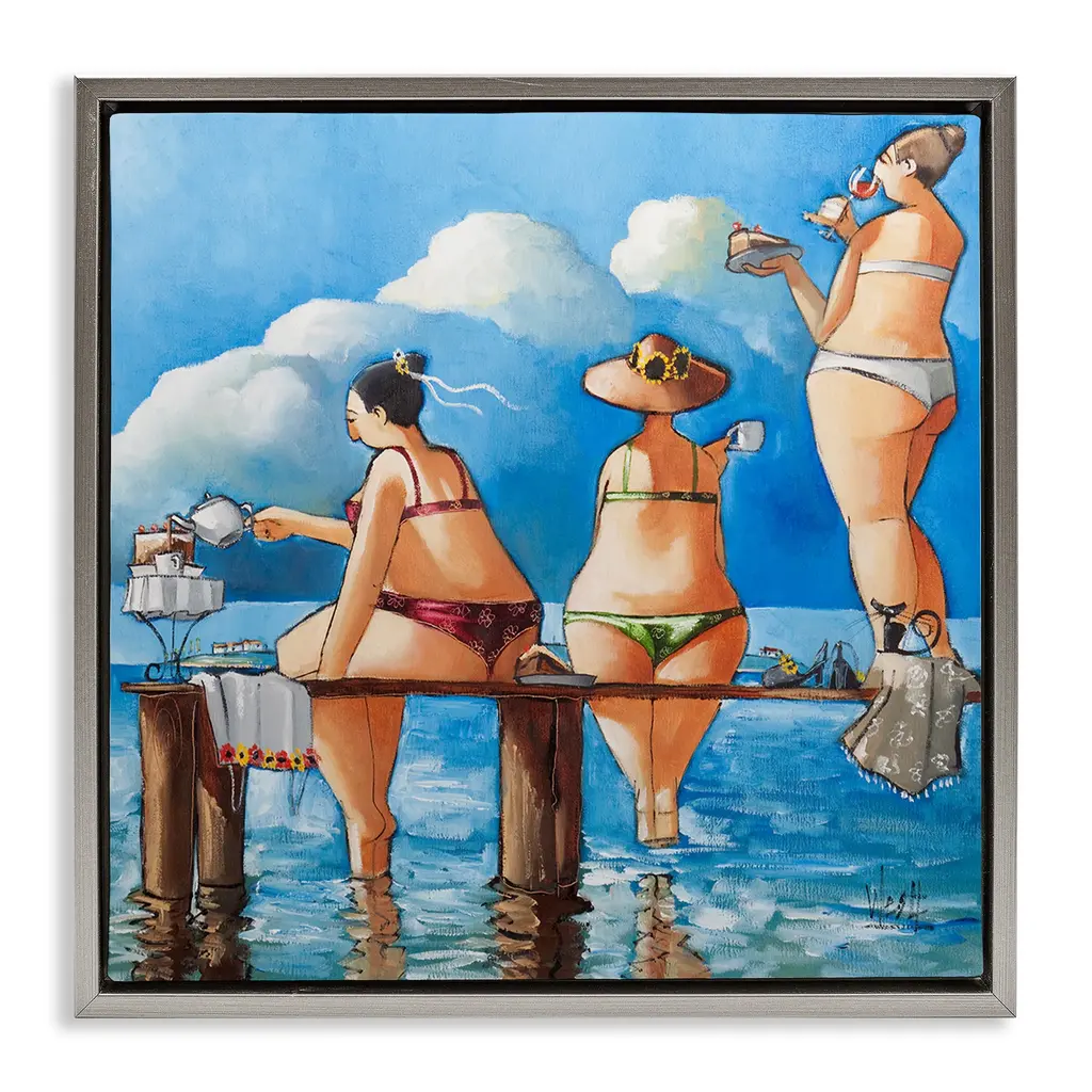 Our Framed Giclee Wall Art adds a touch of class to any space in your home or office. Frames are available in three alluring styles: black, gray farmhouse and white. Our textured artwork will add more depth and dimension to any space. Each piece is mounted with a 1.5 inch thick wood grain frame that is ready to hang! Looking for a statement piece? We have oversized artwork available. Room Type: Living Room, Den, Hallway, Office, Entryway, Study, Dining Room or Bedroom, Guest Room, Studio, Dorm or BoudoirFeatures: Dimensions: 12 x 1.5 x 12 FramedFramed Giclee Sizes Include Standard: 12 x 1.5 x 12 Large: 17 x 1.5 x 17 Oversized: 24 x 1.5 x 24Wall Art is Ready to Hang - No Installation or Hardware Needed. For Easy Set Up Lean or Layer Artwork on Shelf or Against Wall.Our giclée prints are carefully mounted on a durable MDF backing, and then perfectly finished in a 1.5 inch thick woodgrain frame. Mounted frame colors include black, gray farmhouse and white. Made In USA.Artwork Relates To: Person, Woman, Painting, Swimwear, Water, Waterfront, Leisure Activities, Beach, Water, Ocean, CoastDesign by Ronald West