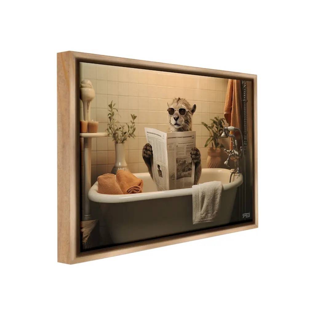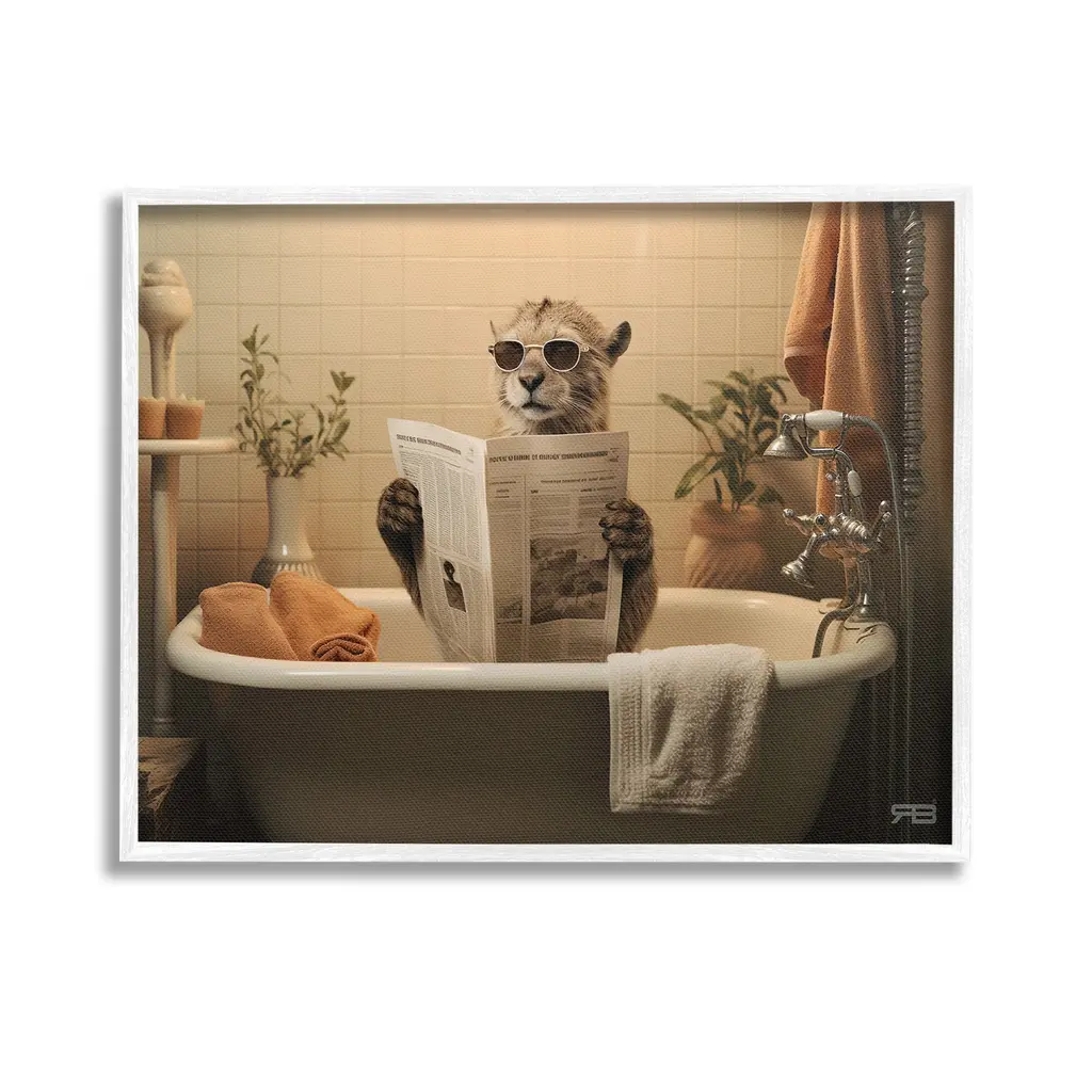 Elevate your home or office to the next level with Stupell Framed Floating Canvas Wall Art. Our premium hand-stretched canvas is mounted securely into a sturdy lightweight frame. The museum-style gap between the wrapped canvas and the box frame gives the illusion of floating artwork. Stupell Wall Art is made in the USA.Features: Dimensions: 21 x 1.7 x 17 Frame, 20 x 1.5 x 16 Canvas ArtFloating Frame Canvas Products are available in sizes 21"x17" and 31"x25". All Floating Frame Canvas Products have a 1.7" Depth.Wall Art is Ready to Hang with Hardware Free Hanging. No Installation required. For Easy Set Up Lean or Layer Artwork on Shelf or Against Wall. Artwork is Permently Fixed into the Frame.Our elevated 1.7" Thick Floating Frame is the perfect complement to our canvas style Wall Art. We use only the highest quality inks in house with industry leading printing solutions. Canvas is hand stretched over a durable wood foundation and then mounted securly into a Modern Box Frame. Made in the USA.Artwork Relates To: Tub, Bathing, Bathtub, Bathroom, Animal, Cat, WildlifeDesign by RB