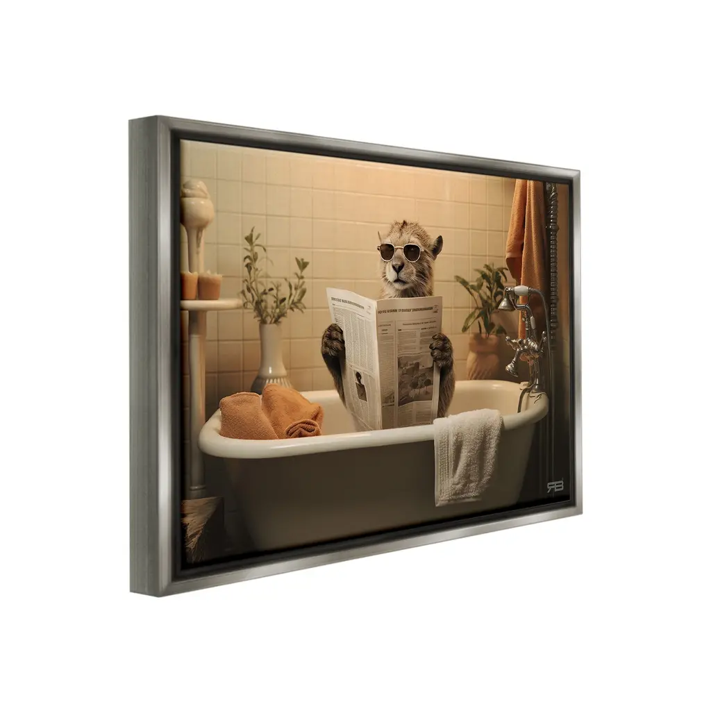Elevate your home or office to the next level with Stupell Framed Floating Canvas Wall Art. Our premium hand-stretched canvas is mounted securely into a sturdy lightweight frame. The museum-style gap between the wrapped canvas and the box frame gives the illusion of floating artwork. Stupell Wall Art is made in the USA.Features: Dimensions: 21 x 1.7 x 17 Frame, 20 x 1.5 x 16 Canvas ArtFloating Frame Canvas Products are available in sizes 21"x17" and 31"x25". All Floating Frame Canvas Products have a 1.7" Depth.Wall Art is Ready to Hang with Hardware Free Hanging. No Installation required. For Easy Set Up Lean or Layer Artwork on Shelf or Against Wall. Artwork is Permently Fixed into the Frame.Our elevated 1.7" Thick Floating Frame is the perfect complement to our canvas style Wall Art. We use only the highest quality inks in house with industry leading printing solutions. Canvas is hand stretched over a durable wood foundation and then mounted securly into a Modern Box Frame. Made in the USA.Artwork Relates To: Tub, Bathing, Bathtub, Bathroom, Animal, Cat, WildlifeDesign by RB