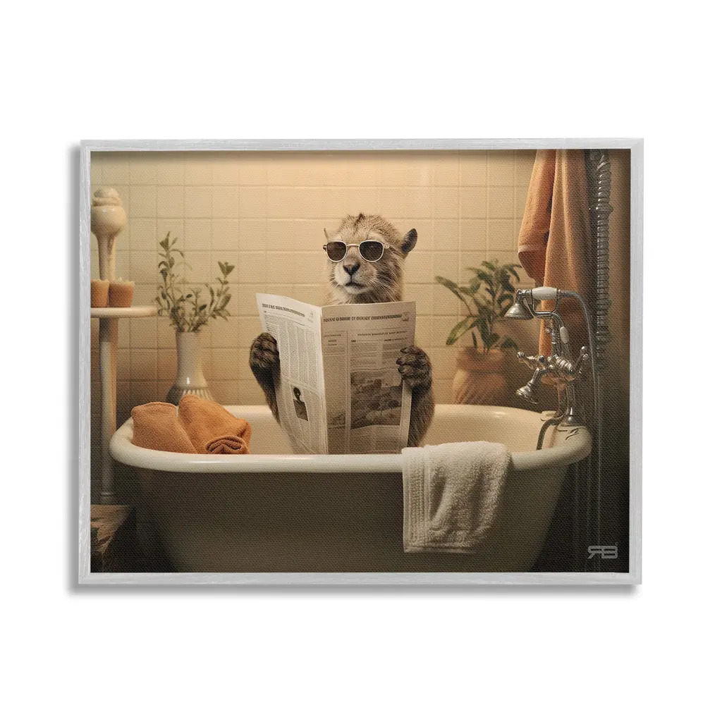 Elevate your home or office to the next level with Stupell Framed Floating Canvas Wall Art. Our premium hand-stretched canvas is mounted securely into a sturdy lightweight frame. The museum-style gap between the wrapped canvas and the box frame gives the illusion of floating artwork. Stupell Wall Art is made in the USA.Features: Dimensions: 21 x 1.7 x 17 Frame, 20 x 1.5 x 16 Canvas ArtFloating Frame Canvas Products are available in sizes 21"x17" and 31"x25". All Floating Frame Canvas Products have a 1.7" Depth.Wall Art is Ready to Hang with Hardware Free Hanging. No Installation required. For Easy Set Up Lean or Layer Artwork on Shelf or Against Wall. Artwork is Permently Fixed into the Frame.Our elevated 1.7" Thick Floating Frame is the perfect complement to our canvas style Wall Art. We use only the highest quality inks in house with industry leading printing solutions. Canvas is hand stretched over a durable wood foundation and then mounted securly into a Modern Box Frame. Made in the USA.Artwork Relates To: Tub, Bathing, Bathtub, Bathroom, Animal, Cat, WildlifeDesign by RB