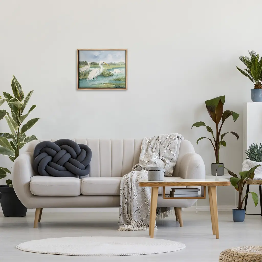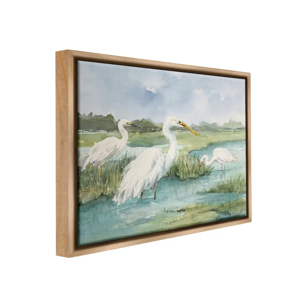 Elevate your home or office to the next level with Stupell Framed Floating Canvas Wall Art. Our premium hand-stretched canvas is mounted securely into a sturdy lightweight frame. The museum-style gap between the wrapped canvas and the box frame gives the illusion of floating artwork. Stupell Wall Art is made in the USA.Features: Dimensions: 21 x 1.7 x 17 Frame, 20 x 1.5 x 16 Canvas ArtFloating Frame Canvas Products are available in sizes 21"x17" and 31"x25". All Floating Frame Canvas Products have a 1.7" Depth.Wall Art is Ready to Hang with Hardware Free Hanging. No Installation required. For Easy Set Up Lean or Layer Artwork on Shelf or Against Wall. Artwork is Permently Fixed into the Frame.Our elevated 1.7" Thick Floating Frame is the perfect complement to our canvas style Wall Art. We use only the highest quality inks in house with industry leading printing solutions. Canvas is hand stretched over a durable wood foundation and then mounted securly into a Modern Box Frame. Made in the USA.Artwork Relates To: Animal, Bird, Waterfowl, Crane Bird, Egret, Heron, Painting, Nature, Lake, Pond, LandscapeDesign by Lanie Loreth