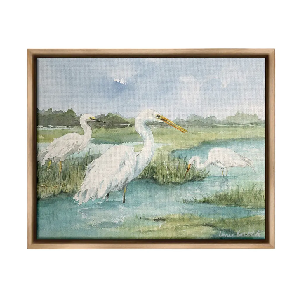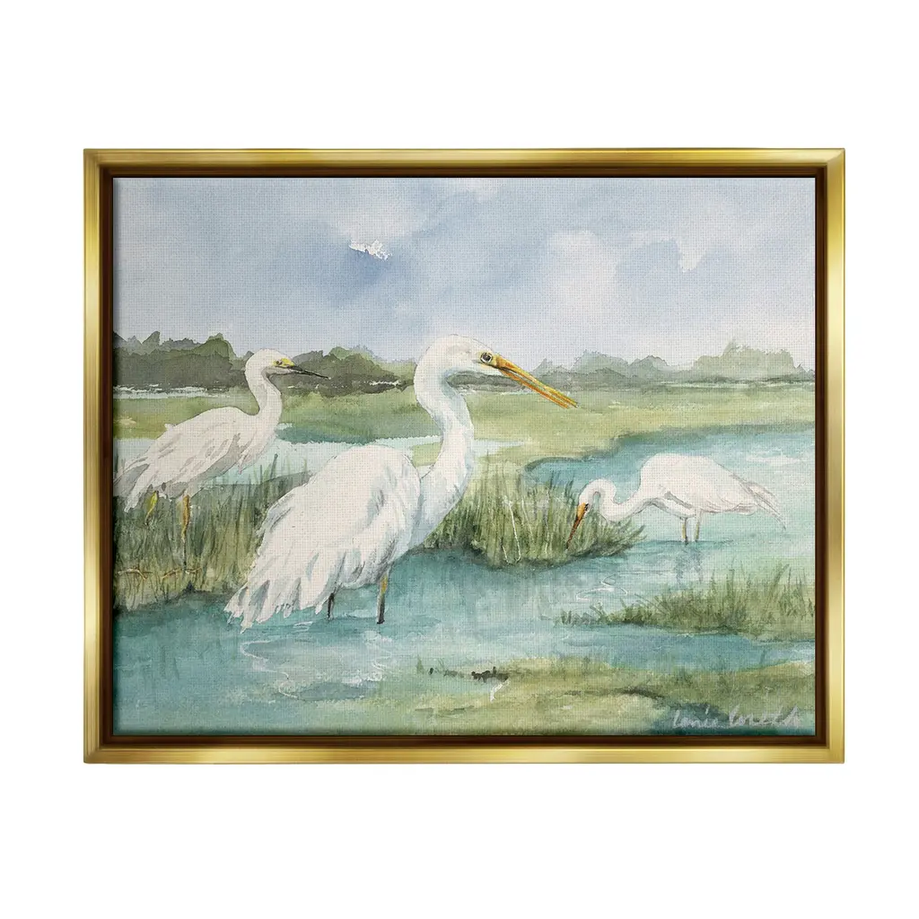 Elevate your home or office to the next level with Stupell Framed Floating Canvas Wall Art. Our premium hand-stretched canvas is mounted securely into a sturdy lightweight frame. The museum-style gap between the wrapped canvas and the box frame gives the illusion of floating artwork. Stupell Wall Art is made in the USA.Features: Dimensions: 21 x 1.7 x 17 Frame, 20 x 1.5 x 16 Canvas ArtFloating Frame Canvas Products are available in sizes 21"x17" and 31"x25". All Floating Frame Canvas Products have a 1.7" Depth.Wall Art is Ready to Hang with Hardware Free Hanging. No Installation required. For Easy Set Up Lean or Layer Artwork on Shelf or Against Wall. Artwork is Permently Fixed into the Frame.Our elevated 1.7" Thick Floating Frame is the perfect complement to our canvas style Wall Art. We use only the highest quality inks in house with industry leading printing solutions. Canvas is hand stretched over a durable wood foundation and then mounted securly into a Modern Box Frame. Made in the USA.Artwork Relates To: Animal, Bird, Waterfowl, Crane Bird, Egret, Heron, Painting, Nature, Lake, Pond, LandscapeDesign by Lanie Loreth