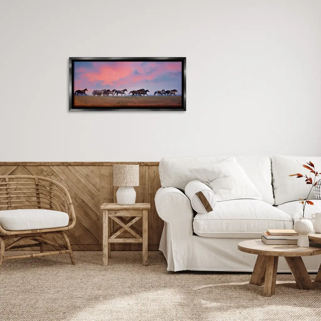 Elevate your home or office to the next level with Stupell Framed Floating Canvas Wall Art. Our premium hand-stretched canvas is mounted securely into a sturdy lightweight frame. The museum-style gap between the wrapped canvas and the box frame gives the illusion of floating artwork. Stupell Wall Art is made in the USA.Features: Dimensions: 25 x 1.7 x 11 Frame, 24 x 1.5 x 10 Canvas ArtFloating Frame Canvas Products are available in sizes 25"x11" and 31"x14". All Floating Frame Canvas Products have a 1.7" Depth.Wall Art is Ready to Hang with Hardware Free Hanging. No Installation required. For Easy Set Up Lean or Layer Artwork on Shelf or Against Wall. Artwork is Permently Fixed into the Frame.Our elevated 1.7" Thick Floating Frame is the perfect complement to our canvas style Wall Art. We use only the highest quality inks in house with industry leading printing solutions. Canvas is hand stretched over a durable wood foundation and then mounted securly into a Modern Box Frame. Made in the USA.Artwork Relates To: Landscape, Rural, Animal, Sunset, Sunrise, HorseDesign by PHBurchett