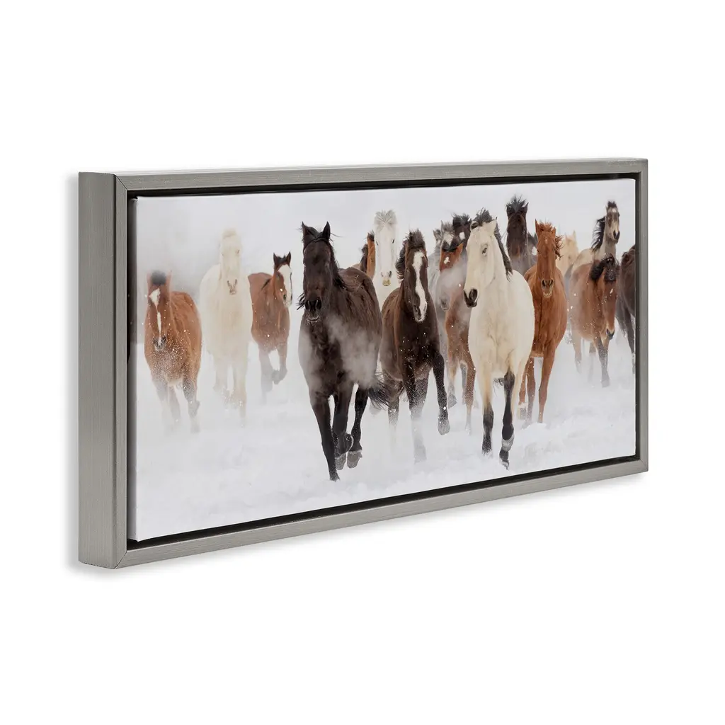 Elevate your home or office to the next level with Stupell Framed Floating Canvas Wall Art. Our premium hand-stretched canvas is mounted securely into a sturdy lightweight frame. The museum-style gap between the wrapped canvas and the box frame gives the illusion of floating artwork. Stupell Wall Art is made in the USA.Features: Dimensions: 25 x 1.7 x 11 Frame, 24 x 1.5 x 10 Canvas ArtFloating Frame Canvas Products are available in sizes 25"x11" and 31"x14". All Floating Frame Canvas Products have a 1.7" Depth.Wall Art is Ready to Hang with Hardware Free Hanging. No Installation required. For Easy Set Up Lean or Layer Artwork on Shelf or Against Wall. Artwork is Permently Fixed into the Frame.Our elevated 1.7" Thick Floating Frame is the perfect complement to our canvas style Wall Art. We use only the highest quality inks in house with industry leading printing solutions. Canvas is hand stretched over a durable wood foundation and then mounted securly into a Modern Box Frame. Made in the USA.Artwork Relates To: Herd, Animal, Nature, Horse, Mammal, Stampede, Equestrian, Snow, WinterDesign by Danita Delimont