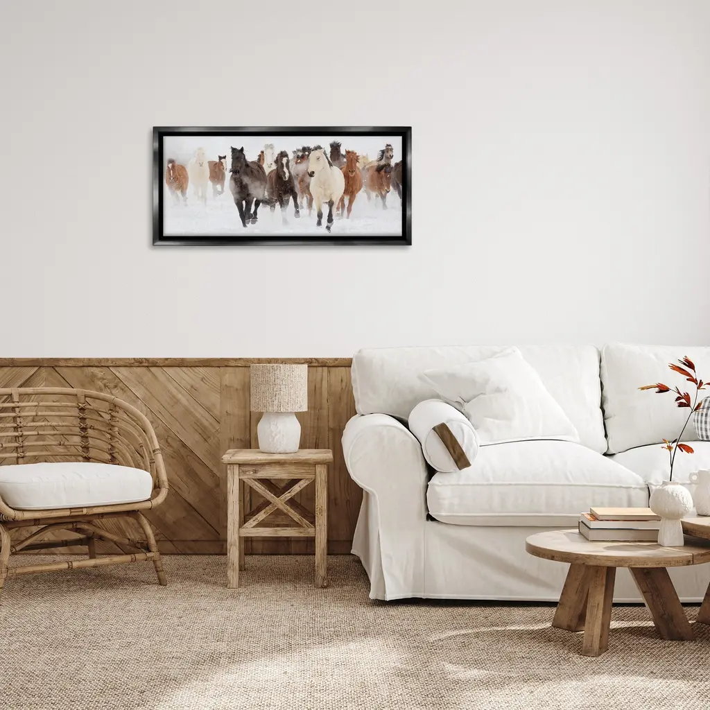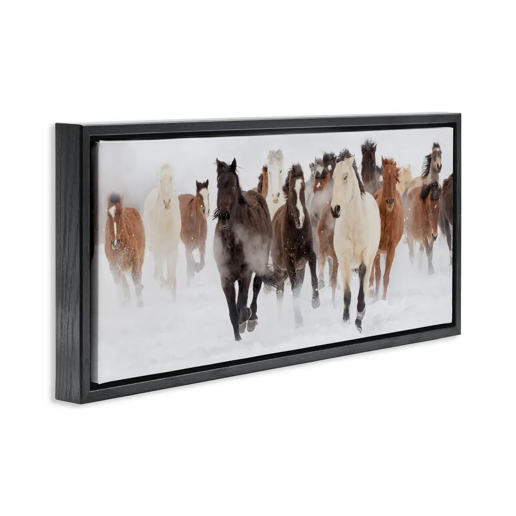 Elevate your home or office to the next level with Stupell Framed Floating Canvas Wall Art. Our premium hand-stretched canvas is mounted securely into a sturdy lightweight frame. The museum-style gap between the wrapped canvas and the box frame gives the illusion of floating artwork. Stupell Wall Art is made in the USA.Features: Dimensions: 25 x 1.7 x 11 Frame, 24 x 1.5 x 10 Canvas ArtFloating Frame Canvas Products are available in sizes 25"x11" and 31"x14". All Floating Frame Canvas Products have a 1.7" Depth.Wall Art is Ready to Hang with Hardware Free Hanging. No Installation required. For Easy Set Up Lean or Layer Artwork on Shelf or Against Wall. Artwork is Permently Fixed into the Frame.Our elevated 1.7" Thick Floating Frame is the perfect complement to our canvas style Wall Art. We use only the highest quality inks in house with industry leading printing solutions. Canvas is hand stretched over a durable wood foundation and then mounted securly into a Modern Box Frame. Made in the USA.Artwork Relates To: Herd, Animal, Nature, Horse, Mammal, Stampede, Equestrian, Snow, WinterDesign by Danita Delimont