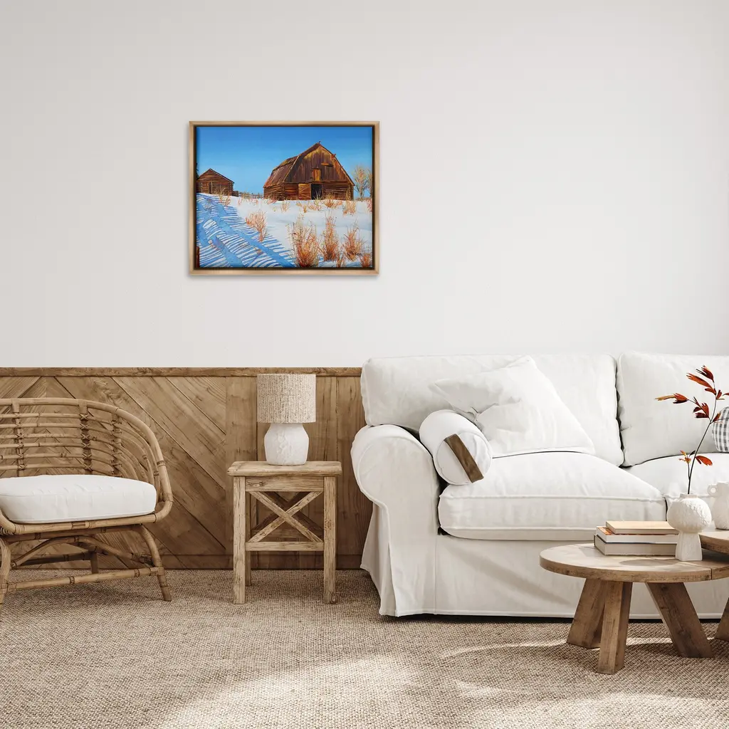 Elevate your home or office to the next level with Stupell Framed Floating Canvas Wall Art. Our premium hand-stretched canvas is mounted securely into a sturdy lightweight frame. The museum-style gap between the wrapped canvas and the box frame gives the illusion of floating artwork. Stupell Wall Art is made in the USA.Features: Dimensions: 21 x 1.7 x 17 Frame, 20 x 1.5 x 16 Canvas ArtFloating Frame Canvas Products are available in sizes 21"x17" and 31"x25". All Floating Frame Canvas Products have a 1.7" Depth.Wall Art is Ready to Hang with Hardware Free Hanging. No Installation required. For Easy Set Up Lean or Layer Artwork on Shelf or Against Wall. Artwork is Permently Fixed into the Frame.Our elevated 1.7" Thick Floating Frame is the perfect complement to our canvas style Wall Art. We use only the highest quality inks in house with industry leading printing solutions. Canvas is hand stretched over a durable wood foundation and then mounted securly into a Modern Box Frame. Made in the USA.Artwork Relates To: Nature, Countryside, Rural, Building, Barn, Farm, House, Cabin, Winter, Snow, LodgeDesign by Andrew Kiss