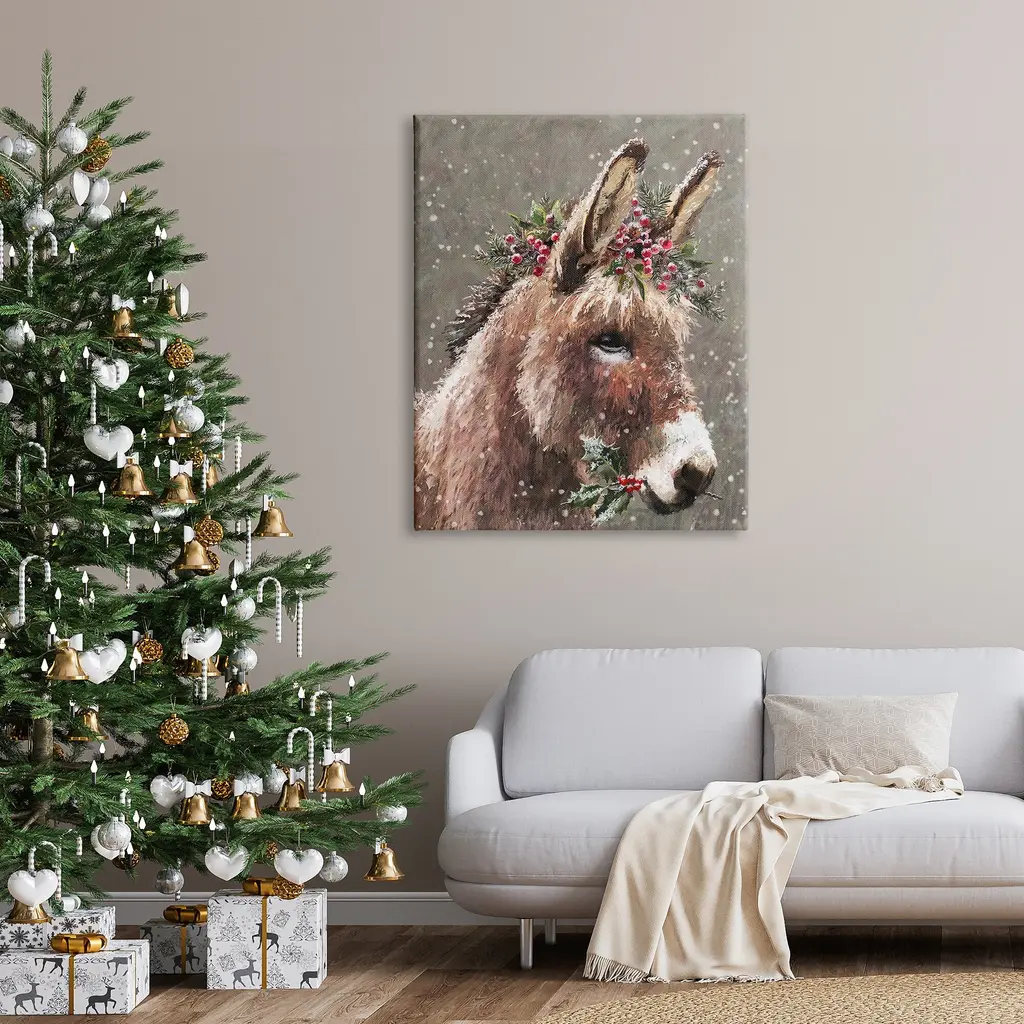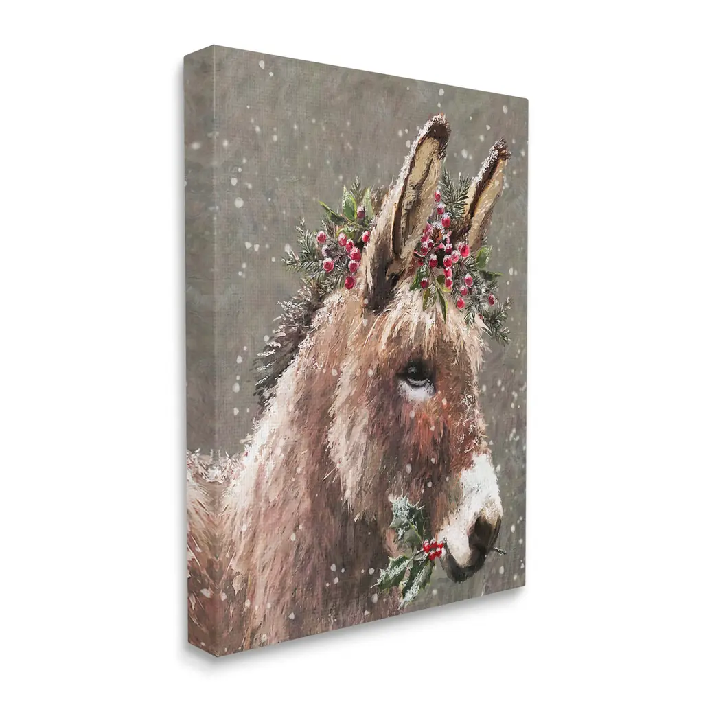 We create our stretched canvas to the highest standards. Using only the highest quality inks and canvas on Mimaki printers, we hand-cut and stretch each piece over a 1.5-inch thick wooden frame for hanging. As a result, the art comes ready to hang on the sturdy ledge with no installation required. Stupell Wall Art is made in the USA.Features: Dimensions: 16 x 1.5 x 20 InchesStretched Canvas Sizes Include Standard: 16 x 1.5 x 20 Large: 20 x 1.5 x 30 X-Large: 30 x 1.5 x 40 Oversized: 36 x 1.5 x 48Wall Art is Ready to Hang - No Installation or Hardware Needed. For Easy Set Up Lean or Layer Artwork on Shelf or Against Wall.Our stretched canvas is created with the highest standards. We use only the highest quality inks and canvas on our in house Mimaki printers, and then hand cut and stretch each piece over a 1.5 inch thick wooden frame for hanging. Made In USA.Artwork Relates To: Animal, Mammal, Flower, Holly Berry, Botanical, Christmas, Snow, DonkeyDesign by Pip Wilson