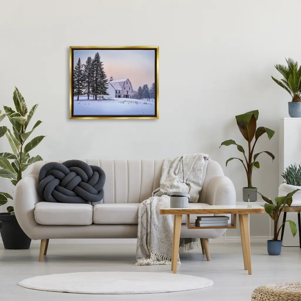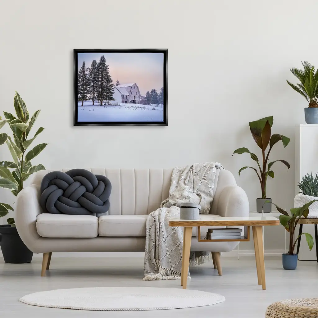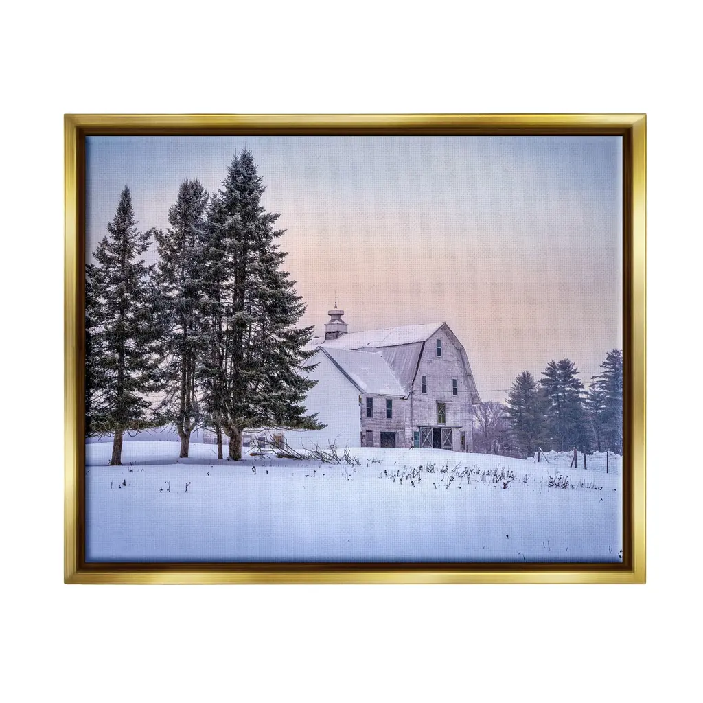Elevate your home or office to the next level with Stupell Framed Floating Canvas Wall Art. Our premium hand-stretched canvas is mounted securely into a sturdy lightweight frame. The museum-style gap between the wrapped canvas and the box frame gives the illusion of floating artwork. Stupell Wall Art is made in the USA.Features: Dimensions: 21 x 1.7 x 17 Frame, 20 x 1.5 x 16 Canvas ArtFloating Frame Sizes Include Standard: 21 x 1.7 x 17 Oversized: 31 x 1.7 x 25Wall Art is Ready to Hang - No Installation or Hardware Needed. For Easy Set Up Lean or Layer Artwork on Shelf or Against Wall.Our elevated 1.7" Thick Floating Frame is the perfect complement to our canvas style Wall Art. We use only the highest quality inks in house with industry leading printing solutions. Canvas is hand stretched over a durable wood foundation and then mounted securly into a Modern Box Frame. Made in the USA.Artwork Relates To: Pine, Nature, House, Countryside, Rural, Scenery, Snow, Winter, Farm, BarnDesign by Rick Berk