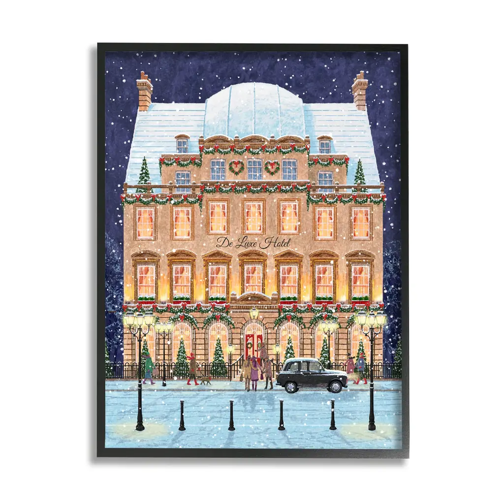 Add dimension to any room with our textured Framed Giclee Artwork. Our framed artwork is securely mounted into a 1.5-inch thick wood grain frame and ready to hang. Frames are available in three alluring styles: black, gray farmhouse and white. In addition, you should check out our oversized options if you want a statement piece. Stupell Wall Art is made in the USA.Features: Dimensions: 11 x 1.5 x 14 FramedFramed Giclee Sizes Include Standard: 11 x 1.5 x 14 Large: 16 x 1.5 x 20 Oversized: 24 x 1.5 x 30Wall Art is Ready to Hang - No Installation or Hardware Needed. For Easy Set Up Lean or Layer Artwork on Shelf or Against Wall.Our giclée prints are carefully mounted on a durable MDF backing, and then perfectly finished in a 1.5 inch thick woodgrain frame. Mounted frame colors include black, gray farmhouse and white. Made In USA.Artwork Relates To: City, Architecture, Building, Car, Person, Christmas, Snow, Winter, Night, De Luxe HotelDesign by Pip Wilson