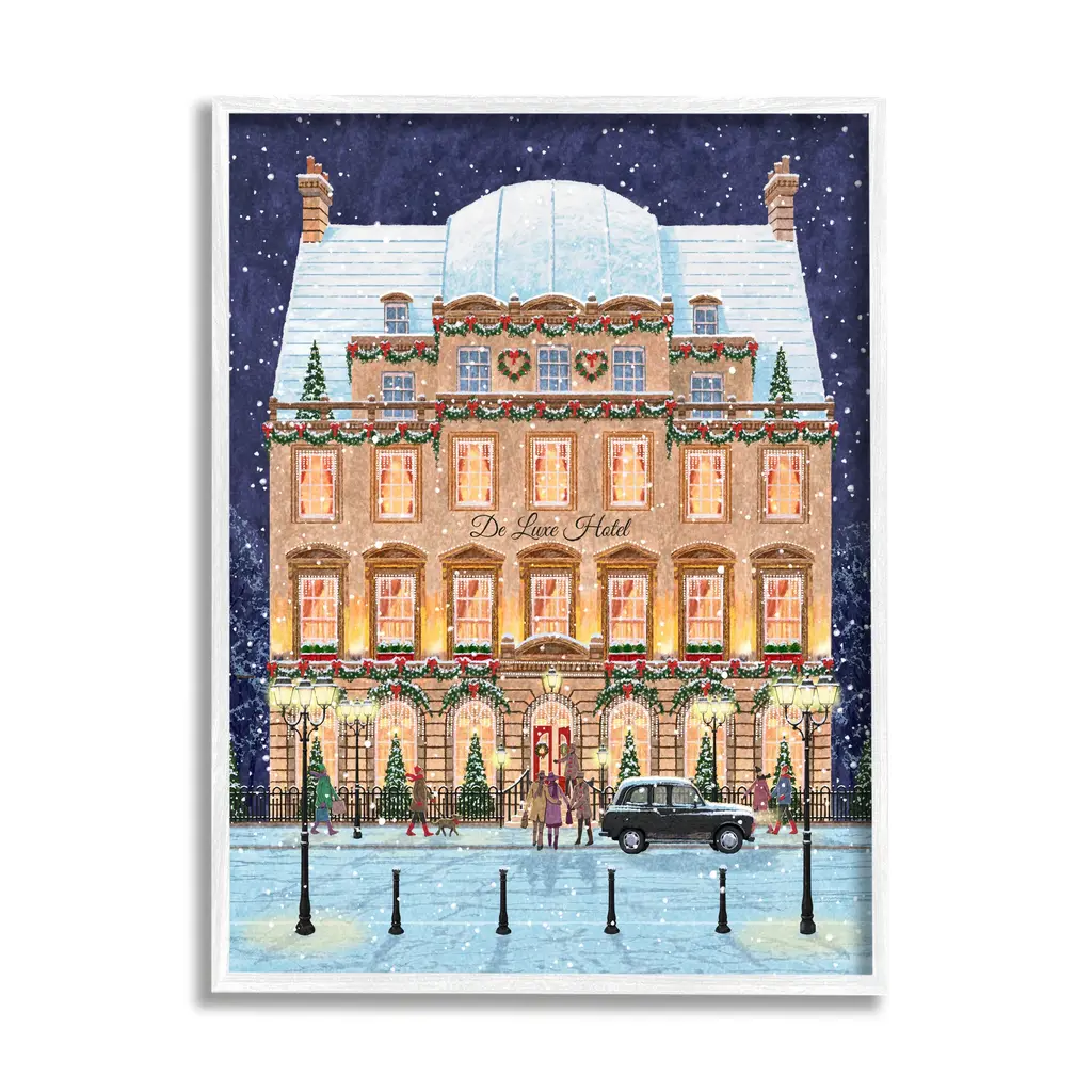 Add dimension to any room with our textured Framed Giclee Artwork. Our framed artwork is securely mounted into a 1.5-inch thick wood grain frame and ready to hang. Frames are available in three alluring styles: black, gray farmhouse and white. In addition, you should check out our oversized options if you want a statement piece. Stupell Wall Art is made in the USA.Features: Dimensions: 11 x 1.5 x 14 FramedFramed Giclee Sizes Include Standard: 11 x 1.5 x 14 Large: 16 x 1.5 x 20 Oversized: 24 x 1.5 x 30Wall Art is Ready to Hang - No Installation or Hardware Needed. For Easy Set Up Lean or Layer Artwork on Shelf or Against Wall.Our giclée prints are carefully mounted on a durable MDF backing, and then perfectly finished in a 1.5 inch thick woodgrain frame. Mounted frame colors include black, gray farmhouse and white. Made In USA.Artwork Relates To: City, Architecture, Building, Car, Person, Christmas, Snow, Winter, Night, De Luxe HotelDesign by Pip Wilson