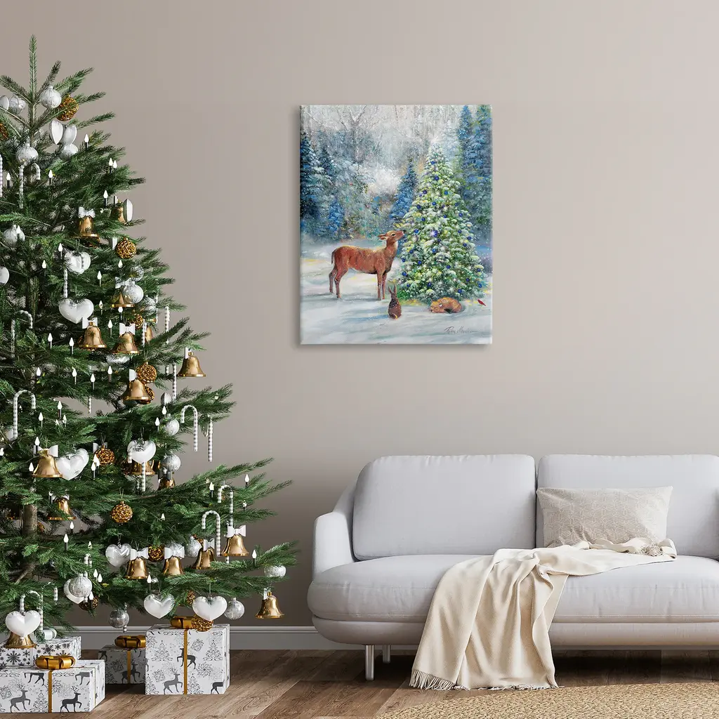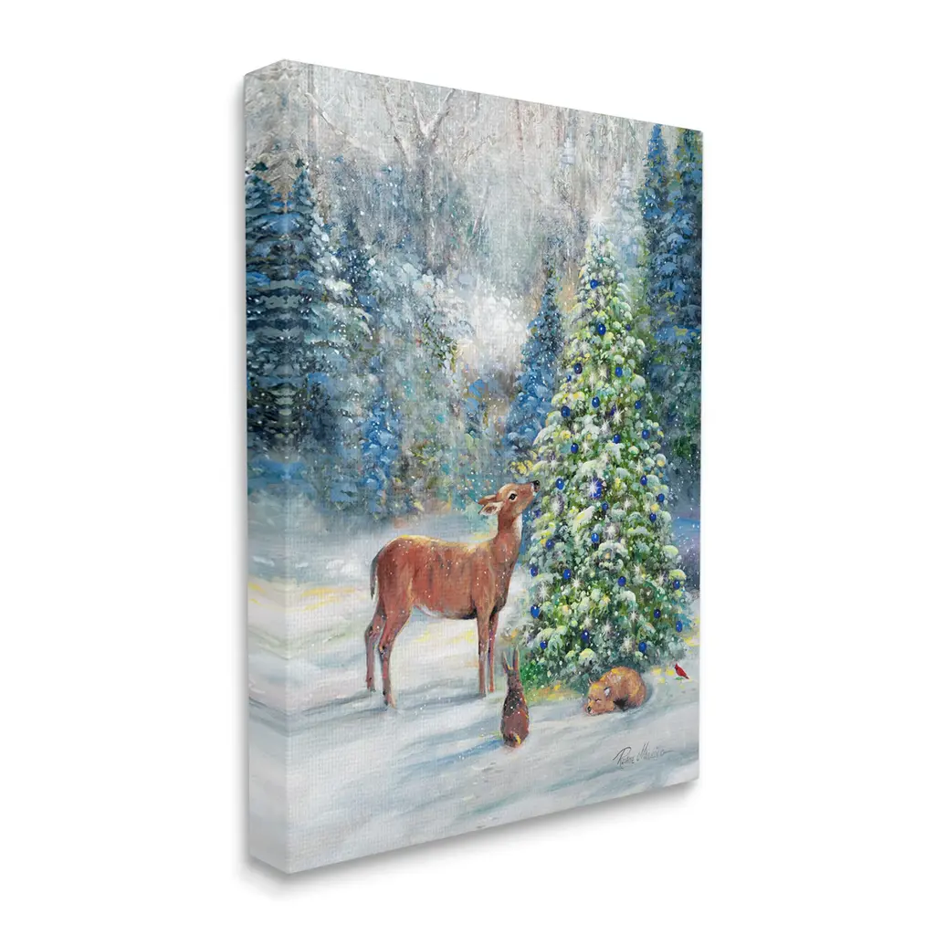 We create our stretched canvas to the highest standards. Using only the highest quality inks and canvas on Mimaki printers, we hand-cut and stretch each piece over a 1.5-inch thick wooden frame for hanging. As a result, the art comes ready to hang on the sturdy ledge with no installation required. Stupell Wall Art is made in the USA.Features: Dimensions: 16 x 1.5 x 20 InchesStretched Canvas Sizes Include Standard: 16 x 1.5 x 20 Large: 20 x 1.5 x 30 X-Large: 30 x 1.5 x 40 Oversized: 36 x 1.5 x 48Wall Art is Ready to Hang - No Installation or Hardware Needed. For Easy Set Up Lean or Layer Artwork on Shelf or Against Wall.Our stretched canvas is created with the highest standards. We use only the highest quality inks and canvas on our in house Mimaki printers, and then hand cut and stretch each piece over a 1.5 inch thick wooden frame for hanging. Made In USA.Artwork Relates To: Tree, Animal, Deer, Mammal, Wildlife, Christmas, Bird, Christmas Tree, Deer, RabbitDesign by Ruane Manning