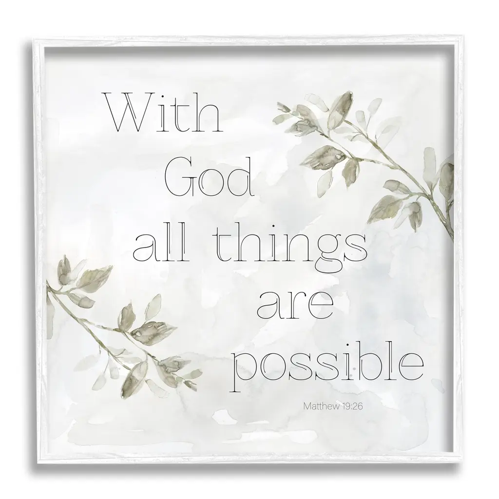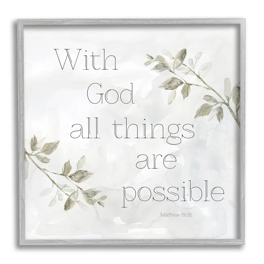Our Framed Giclee Wall Art adds a touch of class to any space in your home or office. Frames are available in three alluring styles: black, gray farmhouse and white. Our textured artwork will add more depth and dimension to any space. Each piece is mounted with a 1.5 inch thick wood grain frame that is ready to hang! Looking for a statement piece? We have oversized artwork available.Features: Wall Art is Ready to Hang - No Installation or Hardware Needed. For Easy Set Up Lean or Layer Artwork on Shelf or Against Wall.Our giclee prints are carefully mounted on a durable MDF backing, and then perfectly finished in a 1.5 inch thick woodgrain frame. Mounted frame colors include black, gray farmhouse and white. Made In USA.Artwork Relates To: Plant; Flower; Matthew 19:26, Religious, Typography, LeavesDesign by Carol Robinson