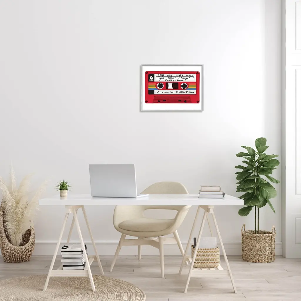Our Framed Giclee Wall Art adds a touch of class to any space in your home or office. Frames are available in three alluring styles: black, gray farmhouse and white. Our textured artwork will add more depth and dimension to any space. Each piece is mounted with a 1.5 inch thick wood grain frame that is ready to hang! Looking for a statement piece? We have oversized artwork available.Features: Dimensions: 14 x 1.5 x 11 FramedFramed Giclee Sizes Include Standard: 14 x 1.5 x 11 Large: 20 x 1.5 x 16 Oversized: 30 x 1.5 x 24Wall Art is Ready to Hang - No Installation or Hardware Needed. For Easy Set Up Lean or Layer Artwork on Shelf or Against Wall.Our giclée prints are carefully mounted on a durable MDF backing, and then perfectly finished in a 1.5 inch thick woodgrain frame. Mounted frame colors include black, gray farmhouse and white. Made In USA.Artwork Relates To: Cassette, Tape, Music, Mix Tape, PhraseDesign by Kamdon KreationsFirst perfectly in any Living Room, Den, Hallway, Office, Entryway, Study, Dining Room or Bed Room.Text Includes: With The Right Music, You Either Forget Everything Or Remember Everything