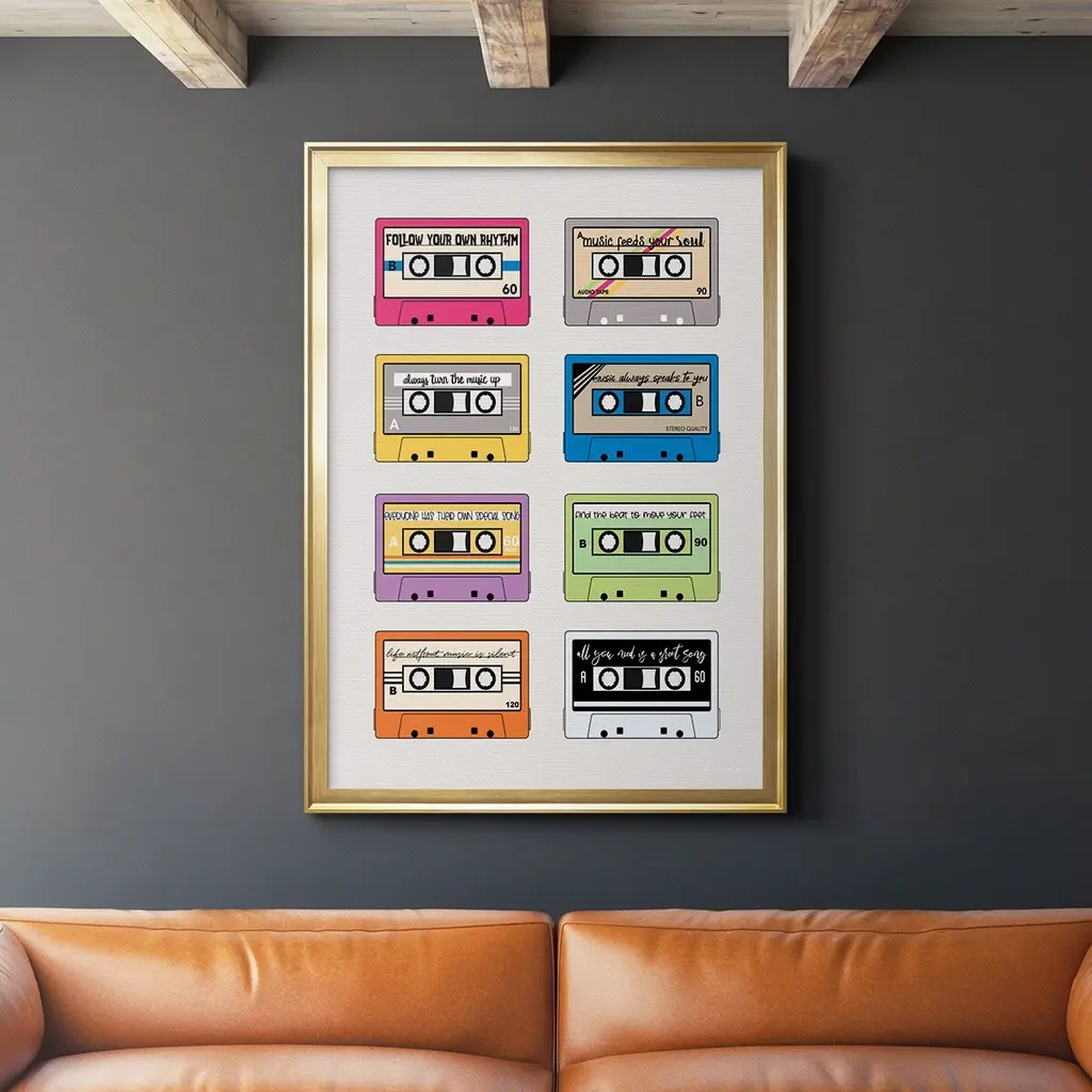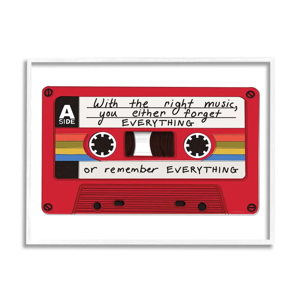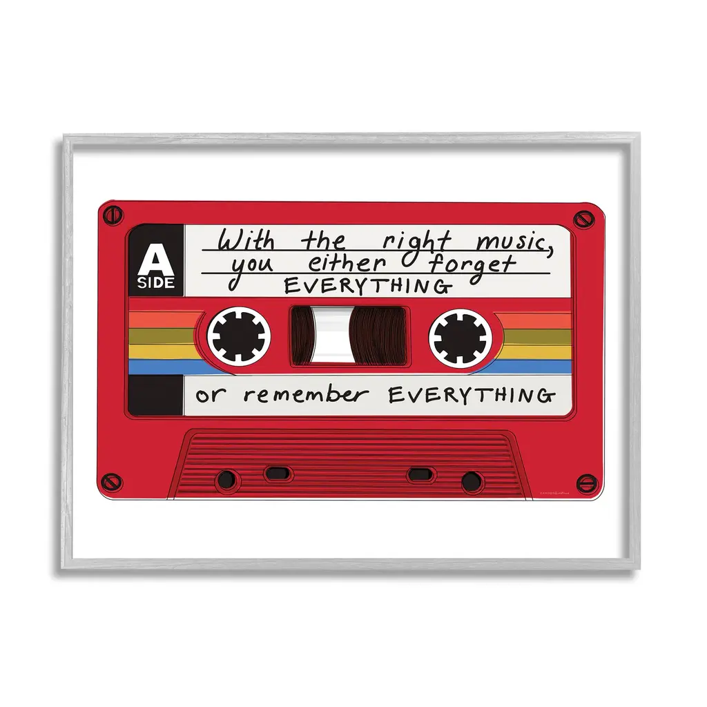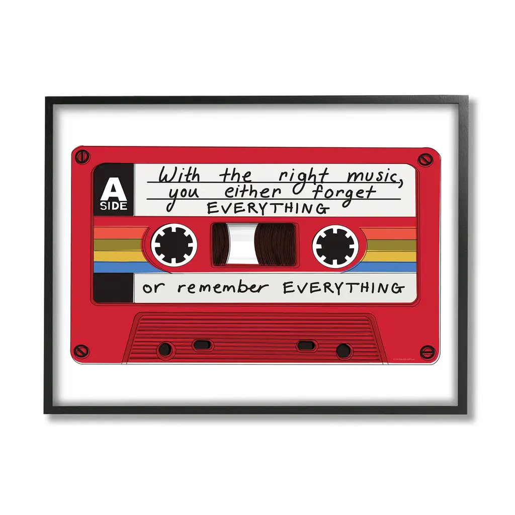 Our Framed Giclee Wall Art adds a touch of class to any space in your home or office. Frames are available in three alluring styles: black, gray farmhouse and white. Our textured artwork will add more depth and dimension to any space. Each piece is mounted with a 1.5 inch thick wood grain frame that is ready to hang! Looking for a statement piece? We have oversized artwork available.Features: Dimensions: 14 x 1.5 x 11 FramedFramed Giclee Sizes Include Standard: 14 x 1.5 x 11 Large: 20 x 1.5 x 16 Oversized: 30 x 1.5 x 24Wall Art is Ready to Hang - No Installation or Hardware Needed. For Easy Set Up Lean or Layer Artwork on Shelf or Against Wall.Our giclée prints are carefully mounted on a durable MDF backing, and then perfectly finished in a 1.5 inch thick woodgrain frame. Mounted frame colors include black, gray farmhouse and white. Made In USA.Artwork Relates To: Cassette, Tape, Music, Mix Tape, PhraseDesign by Kamdon KreationsFirst perfectly in any Living Room, Den, Hallway, Office, Entryway, Study, Dining Room or Bed Room.Text Includes: With The Right Music, You Either Forget Everything Or Remember Everything