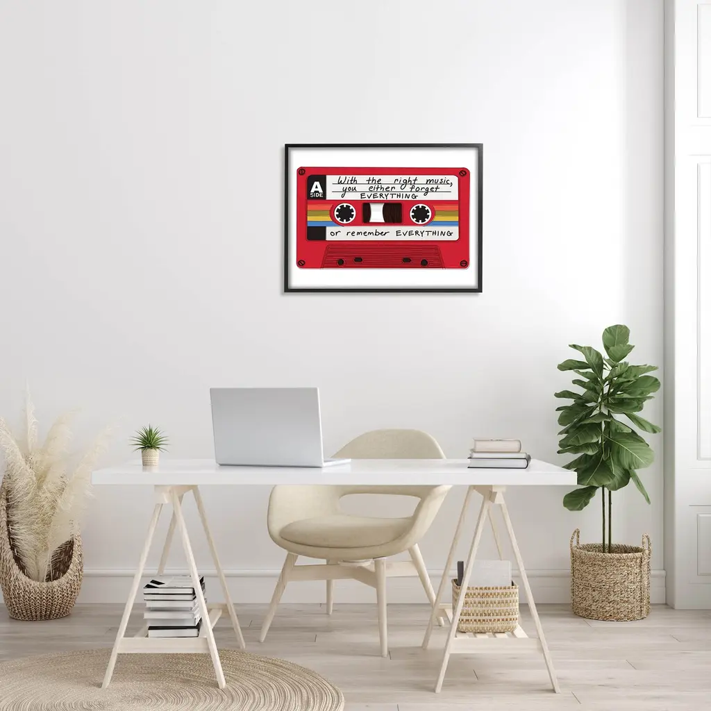 Our Framed Giclee Wall Art adds a touch of class to any space in your home or office. Frames are available in three alluring styles: black, gray farmhouse and white. Our textured artwork will add more depth and dimension to any space. Each piece is mounted with a 1.5 inch thick wood grain frame that is ready to hang! Looking for a statement piece? We have oversized artwork available.Features: Dimensions: 14 x 1.5 x 11 FramedFramed Giclee Sizes Include Standard: 14 x 1.5 x 11 Large: 20 x 1.5 x 16 Oversized: 30 x 1.5 x 24Wall Art is Ready to Hang - No Installation or Hardware Needed. For Easy Set Up Lean or Layer Artwork on Shelf or Against Wall.Our giclée prints are carefully mounted on a durable MDF backing, and then perfectly finished in a 1.5 inch thick woodgrain frame. Mounted frame colors include black, gray farmhouse and white. Made In USA.Artwork Relates To: Cassette, Tape, Music, Mix Tape, PhraseDesign by Kamdon KreationsFirst perfectly in any Living Room, Den, Hallway, Office, Entryway, Study, Dining Room or Bed Room.Text Includes: With The Right Music, You Either Forget Everything Or Remember Everything