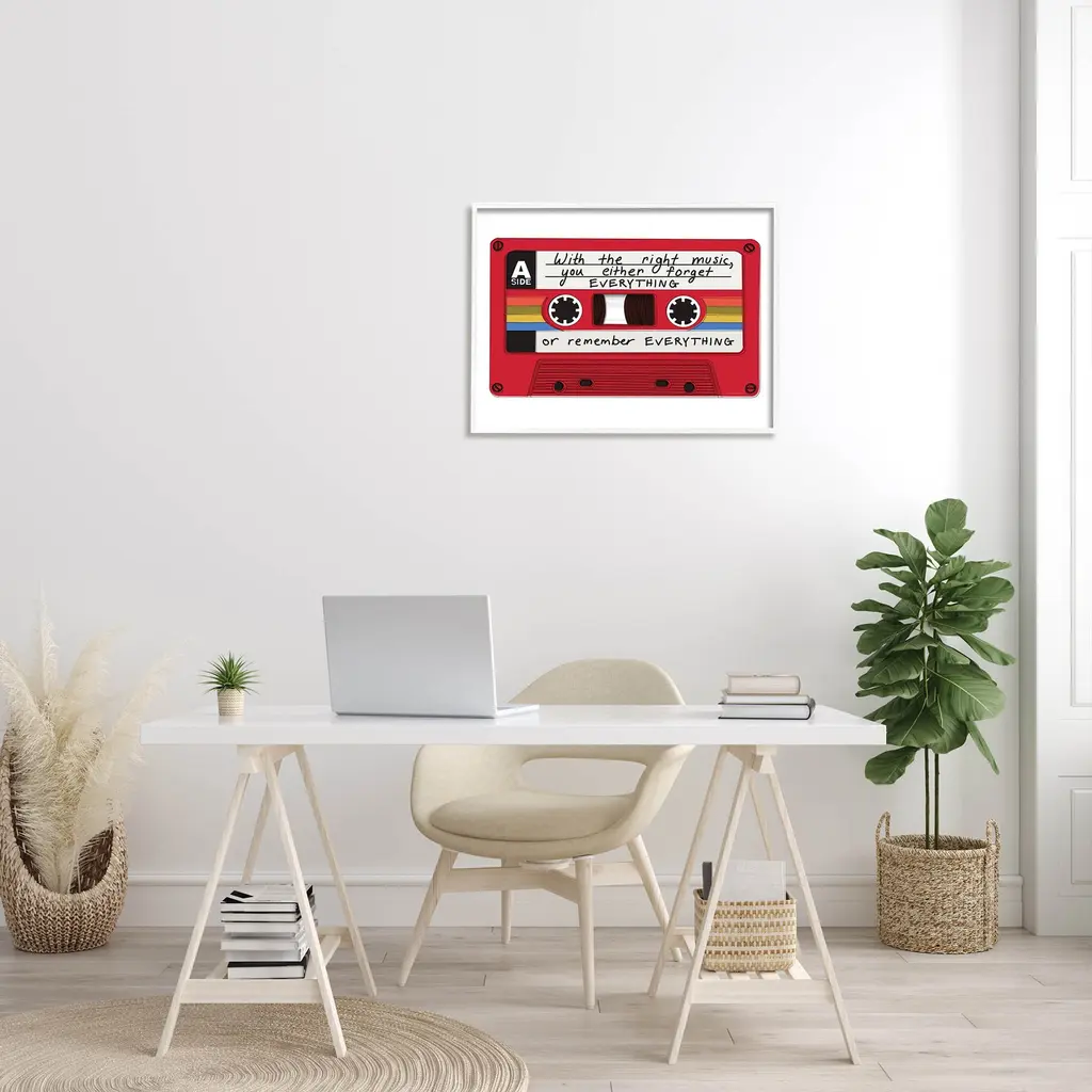 Our Framed Giclee Wall Art adds a touch of class to any space in your home or office. Frames are available in three alluring styles: black, gray farmhouse and white. Our textured artwork will add more depth and dimension to any space. Each piece is mounted with a 1.5 inch thick wood grain frame that is ready to hang! Looking for a statement piece? We have oversized artwork available.Features: Dimensions: 14 x 1.5 x 11 FramedFramed Giclee Sizes Include Standard: 14 x 1.5 x 11 Large: 20 x 1.5 x 16 Oversized: 30 x 1.5 x 24Wall Art is Ready to Hang - No Installation or Hardware Needed. For Easy Set Up Lean or Layer Artwork on Shelf or Against Wall.Our giclée prints are carefully mounted on a durable MDF backing, and then perfectly finished in a 1.5 inch thick woodgrain frame. Mounted frame colors include black, gray farmhouse and white. Made In USA.Artwork Relates To: Cassette, Tape, Music, Mix Tape, PhraseDesign by Kamdon KreationsFirst perfectly in any Living Room, Den, Hallway, Office, Entryway, Study, Dining Room or Bed Room.Text Includes: With The Right Music, You Either Forget Everything Or Remember Everything