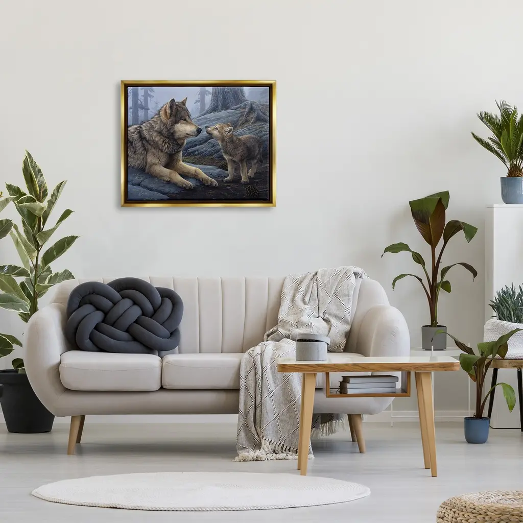 Stupell Wolf & Cub Woodland Forest Framed Floater Canvas Wall Art By Daniel Smith - 30 X 24 - Gold