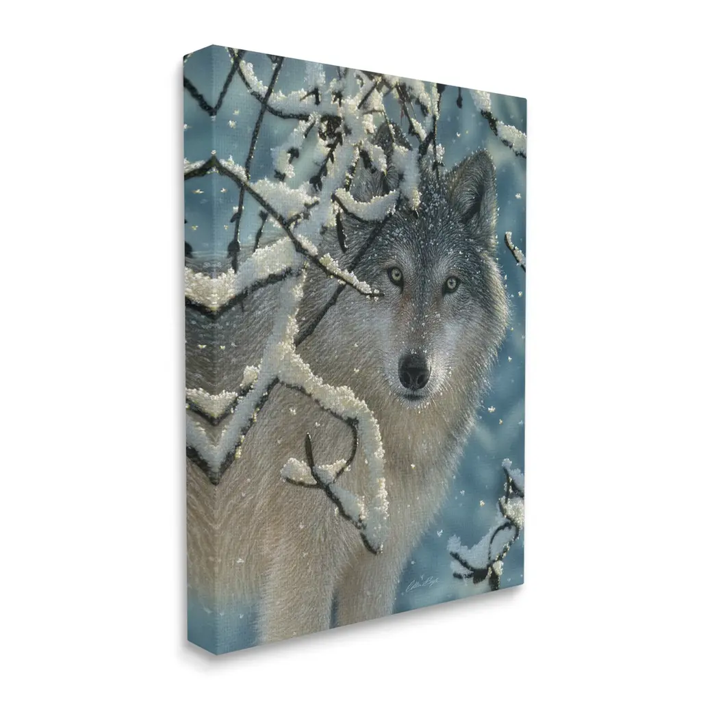 Stupell Wolf Behind Snowy Branches Winter Wild Forest Animal Canvas Wall Art - Blue - 16 X 20