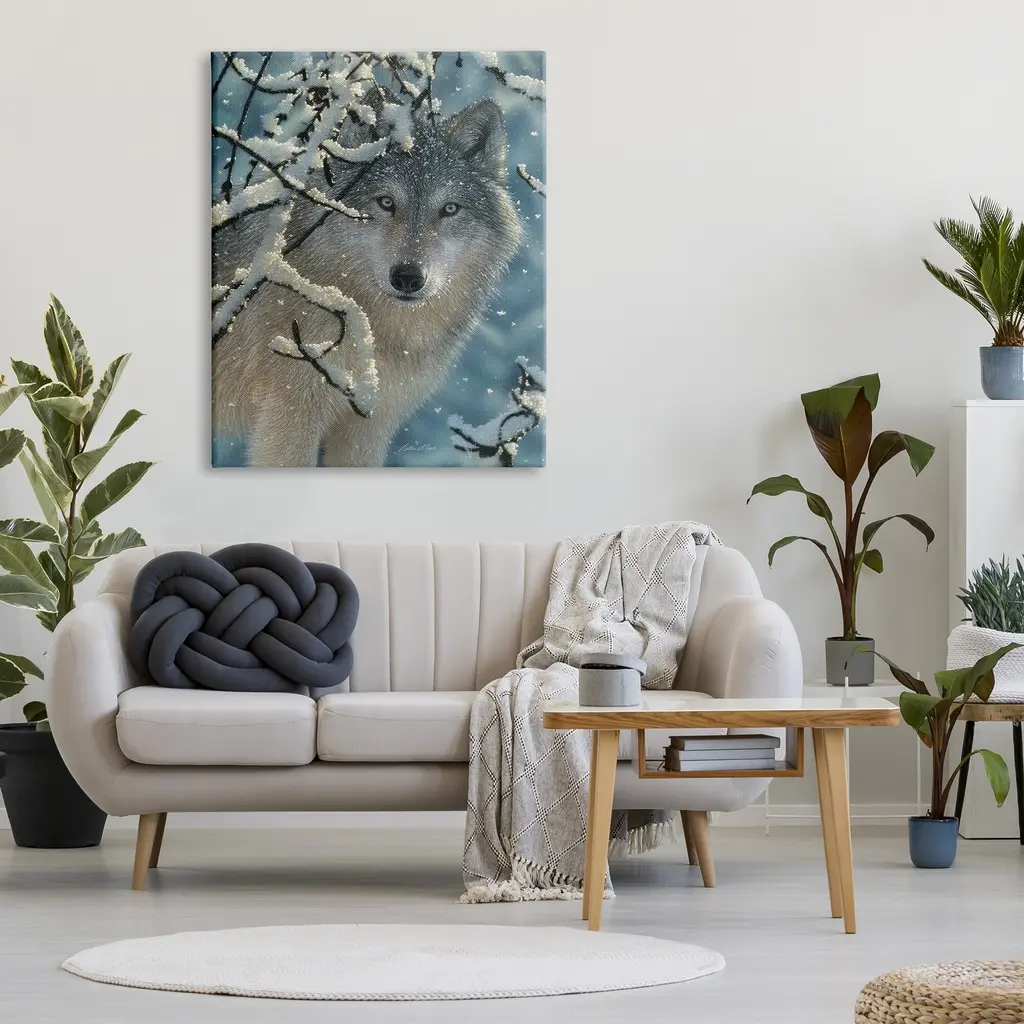 Stupell Wolf Behind Snowy Branches Winter Wild Forest Animal Canvas Wall Art - Blue - 36 X 48