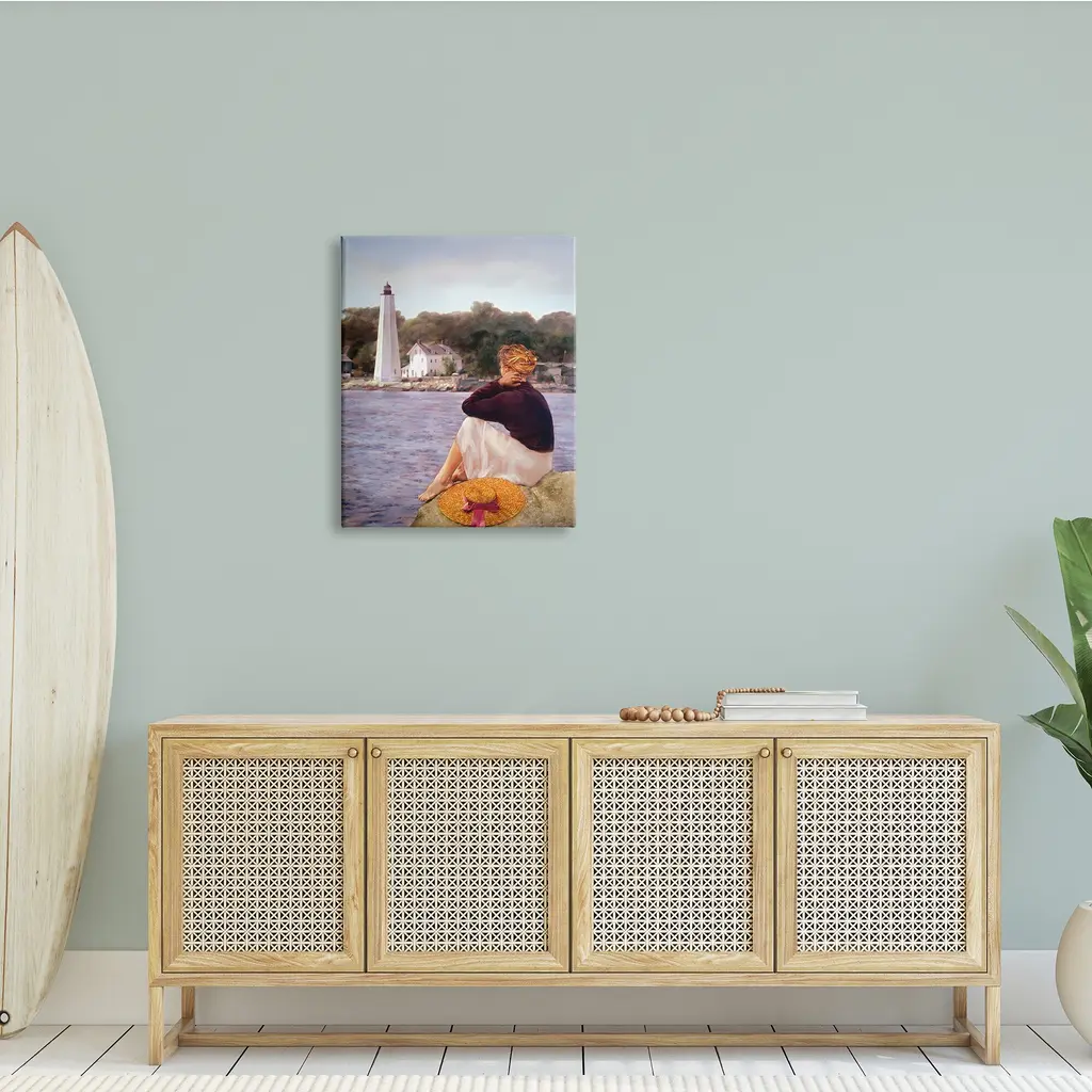 Stupell Woman At Shoreline Coast Lighthouse Realistic Nautical Painting Canvas Wall Art - Blue - 24 X 30
