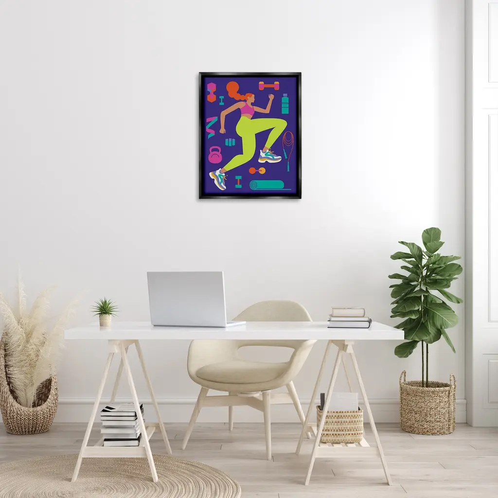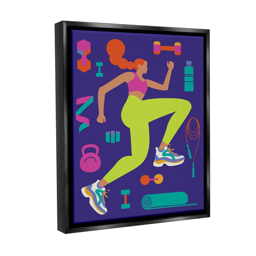 Elevate your home or office to the next level with Stupell Framed Floating Canvas Wall Art. Our premium hand-stretched canvas is mounted securely into a sturdy lightweight frame. The museum-style gap between the wrapped canvas and the box frame gives the illusion of floating artwork. Stupell Wall Art is made in the USA.Features: Dimensions: 17 x 1.7 x 21 Frame, 16 x 1.5 x 20 Canvas ArtFloating Frame Canvas Products are available in sizes 17"x21" and 25"x31". All Floating Frame Canvas Products have a 1.7" Depth.Wall Art is Ready to Hang with Hardware Free Hanging. No Installation required. For Easy Set Up Lean or Layer Artwork on Shelf or Against Wall. Artwork is Permently Fixed into the Frame.Our elevated 1.7" Thick Floating Frame is the perfect complement to our canvas style Wall Art. We use only the highest quality inks in house with industry leading printing solutions. Canvas is hand stretched over a durable wood foundation and then mounted securly into a Modern Box Frame. Made in the USA.Artwork Relates To: Person, Exercise, Workout, Woman, Modern, Weights, PatternDesign by Victoria Barnes