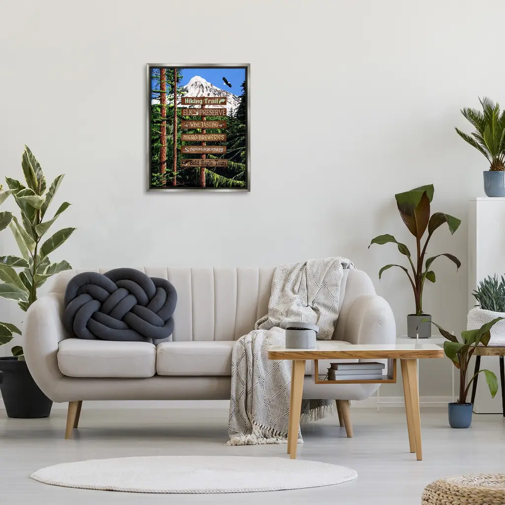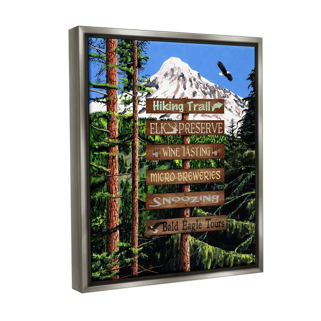 Elevate your home or office to the next level with Stupell Framed Floating Canvas Wall Art. Our premium hand-stretched canvas is mounted securely into a sturdy lightweight frame. The museum-style gap between the wrapped canvas and the box frame gives the illusion of floating artwork. Stupell Wall Art is made in the USA.Features: Dimensions: 17 x 1.7 x 21 Frame, 16 x 1.5 x 20 Canvas ArtFloating Frame Canvas Products are available in sizes 17"x21" and 25"x31". All Floating Frame Canvas Products have a 1.7" Depth.Wall Art is Ready to Hang with Hardware Free Hanging. No Installation required. For Easy Set Up Lean or Layer Artwork on Shelf or Against Wall. Artwork is Permently Fixed into the Frame.Our elevated 1.7" Thick Floating Frame is the perfect complement to our canvas style Wall Art. We use only the highest quality inks in house with industry leading printing solutions. Canvas is hand stretched over a durable wood foundation and then mounted securly into a Modern Box Frame. Made in the USA.Artwork Relates To: Plant, Vegetation, Tree, Land, Nature, Woodland, Animal, Bird, Sign, Forest, Mountain, HikingDesign by Gail Fraser