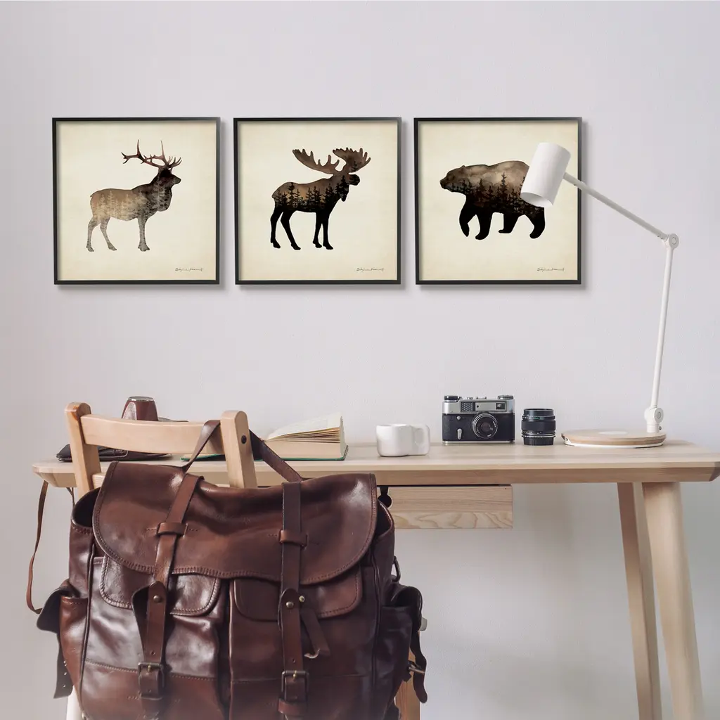 Stupell Woodland Animal Silhouettes Rustic Forest Pine Tree Landscape 3Pc Multi Piece Framed Wall Art Set - Tan - 17 X 17 - Black