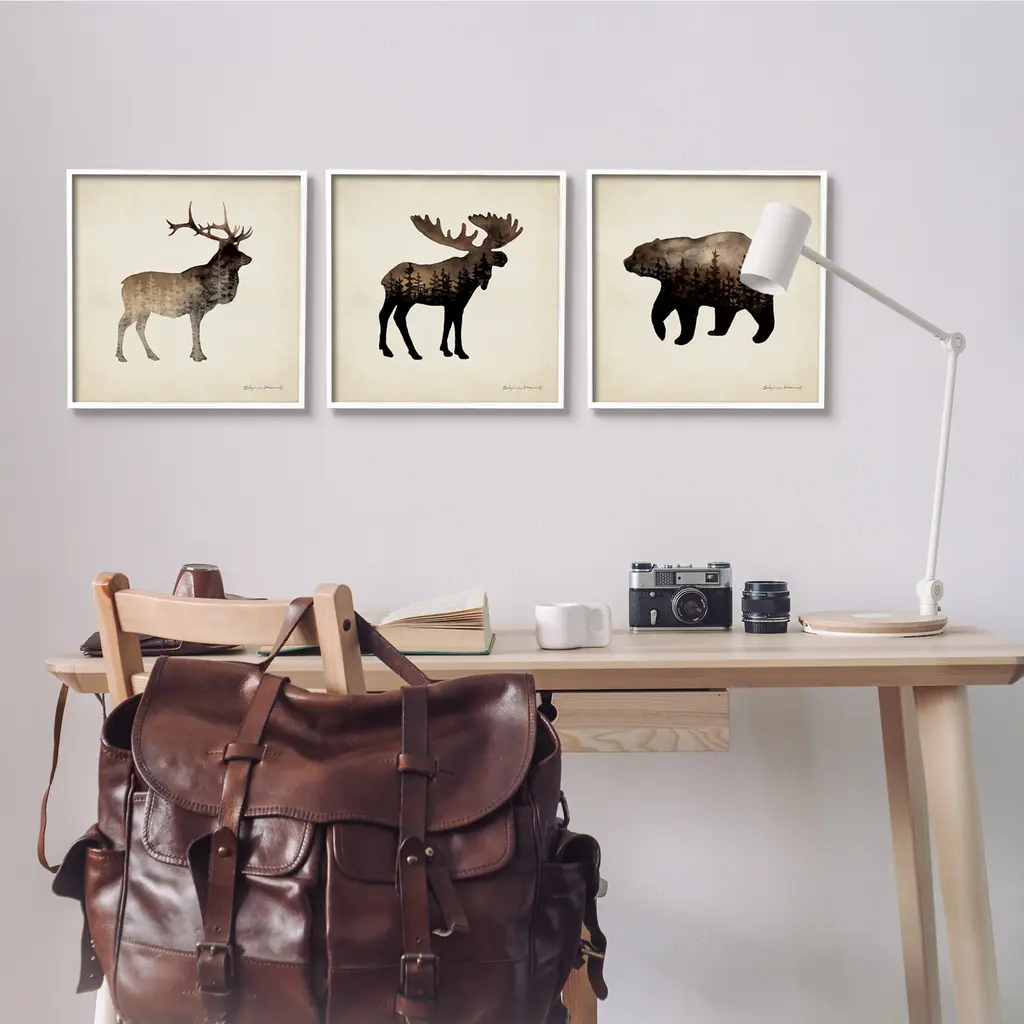 Stupell Woodland Animal Silhouettes Rustic Forest Pine Tree Landscape 3Pc Multi Piece Framed Wall Art Set - Tan - 17 X 17 - White
