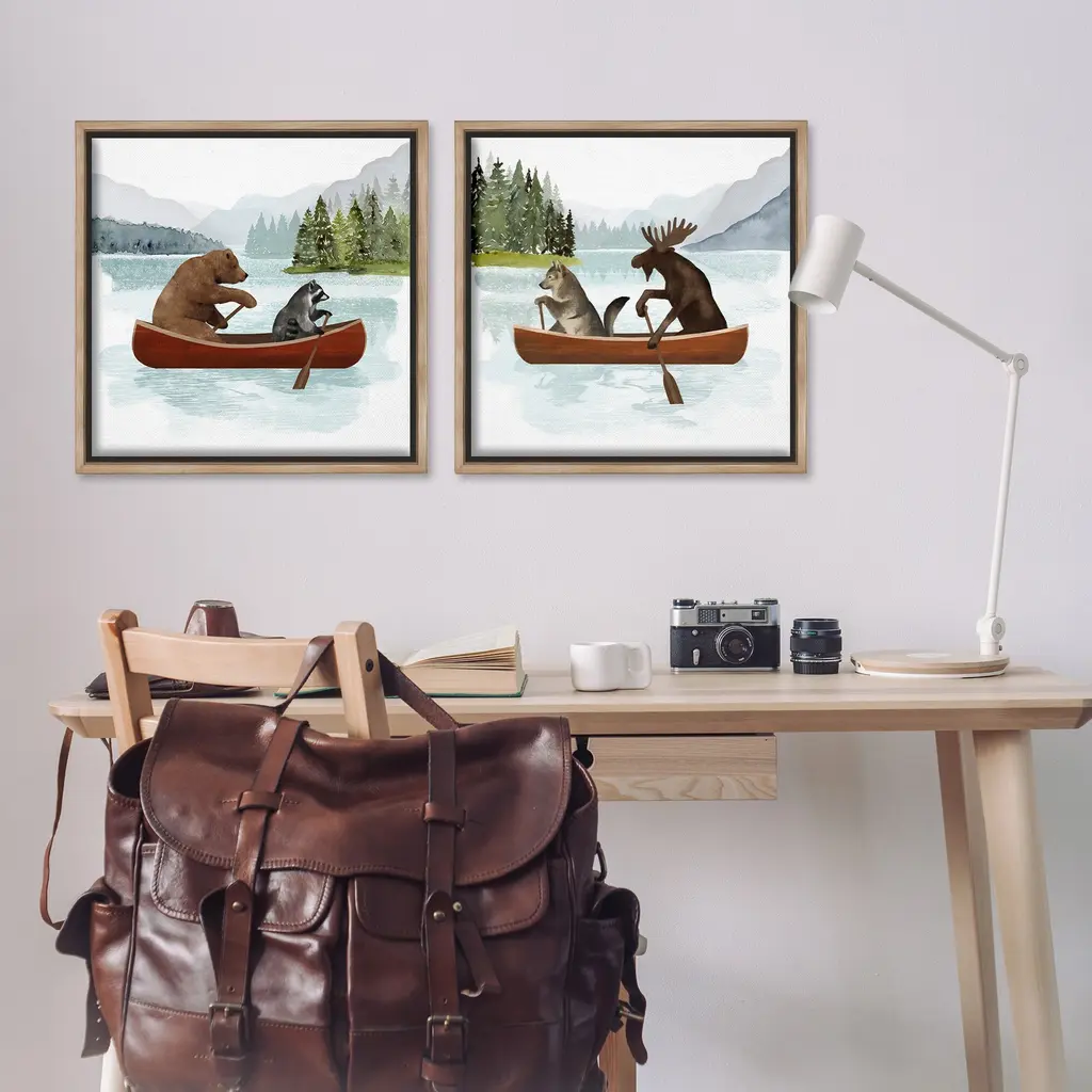 Elevate your home or office to the next level with Stupell Framed Floating Canvas Wall Art. Our premium hand-stretched canvas is mounted securely into a sturdy lightweight frame. The museum-style gap between the wrapped canvas and the box frame gives the illusion of floating artwork. Stupell Wall Art is made in the USA.Features: Dimensions: 2 Piece Set, Each Frame is 18 x 1.7 x 18Two Piece Floating Frame Canvas Products are available as 18"x18" or 25"x25" Panels. All Floating Frame Canvas Products have a 1.7" Depth.Wall Art is Ready to Hang with Hardware Free Hanging. No Installation required. For Easy Set Up Lean or Layer Artwork on Shelf or Against Wall. Artwork is Permently Fixed into the Frame.Our elevated 1.7" Thick Floating Frame is the perfect complement to our canvas style Wall Art. We use only the highest quality inks in house with industry leading printing solutions. Canvas is hand stretched over a durable wood foundation and then mounted securly into a Modern Box Frame. Made in the USA.Artwork Relates To: Boat, Canoe, Canoeing, Animal, Bear, Mammal, Wildlife, LakeDesign by Victoria Barnes