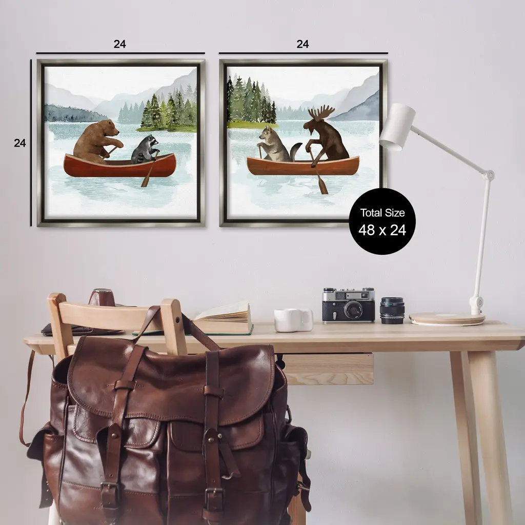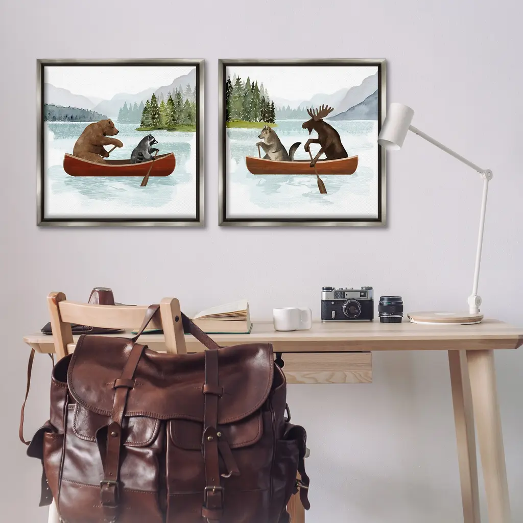 Elevate your home or office to the next level with Stupell Framed Floating Canvas Wall Art. Our premium hand-stretched canvas is mounted securely into a sturdy lightweight frame. The museum-style gap between the wrapped canvas and the box frame gives the illusion of floating artwork. Stupell Wall Art is made in the USA.Features: Dimensions: 2 Piece Set, Each Frame is 18 x 1.7 x 18Two Piece Floating Frame Canvas Products are available as 18"x18" or 25"x25" Panels. All Floating Frame Canvas Products have a 1.7" Depth.Wall Art is Ready to Hang with Hardware Free Hanging. No Installation required. For Easy Set Up Lean or Layer Artwork on Shelf or Against Wall. Artwork is Permently Fixed into the Frame.Our elevated 1.7" Thick Floating Frame is the perfect complement to our canvas style Wall Art. We use only the highest quality inks in house with industry leading printing solutions. Canvas is hand stretched over a durable wood foundation and then mounted securly into a Modern Box Frame. Made in the USA.Artwork Relates To: Boat, Canoe, Canoeing, Animal, Bear, Mammal, Wildlife, LakeDesign by Victoria Barnes