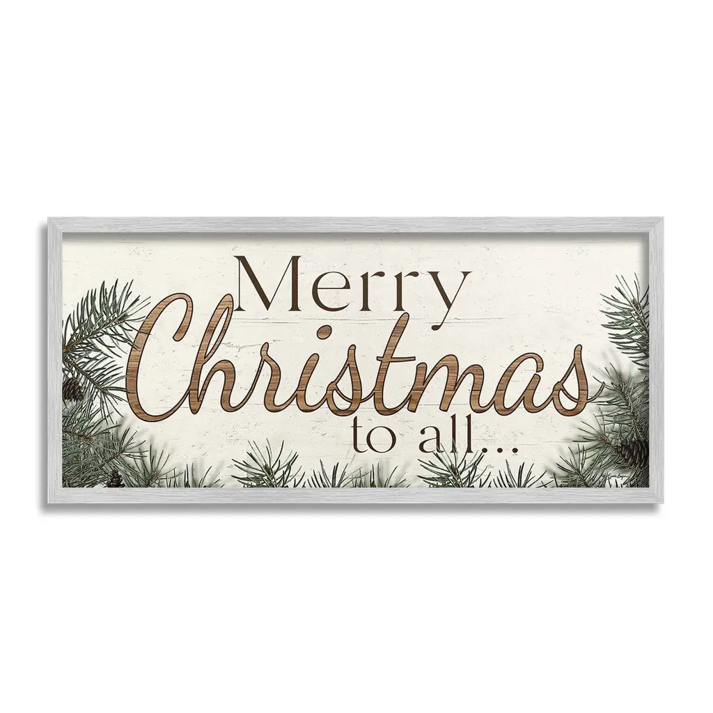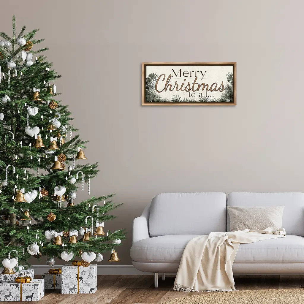 Elevate your home or office to the next level with Stupell Framed Floating Canvas Wall Art. Our premium hand-stretched canvas is mounted securely into a sturdy lightweight frame. The museum-style gap between the wrapped canvas and the box frame gives the illusion of floating artwork. Stupell Wall Art is made in the USA.Features: Dimensions: 25 x 1.7 x 11 Frame, 24 x 1.5 x 10 Canvas ArtFloating Frame Canvas Products are available in sizes 25"x11" and 31"x14". All Floating Frame Canvas Products have a 1.7" Depth.Wall Art is Ready to Hang with Hardware Free Hanging. No Installation required. For Easy Set Up Lean or Layer Artwork on Shelf or Against Wall. Artwork is Permently Fixed into the Frame.Our elevated 1.7" Thick Floating Frame is the perfect complement to our canvas style Wall Art. We use only the highest quality inks in house with industry leading printing solutions. Canvas is hand stretched over a durable wood foundation and then mounted securly into a Modern Box Frame. Made in the USA.Artwork Relates To: Winter, Seasonal, Holiday, Christmas, Tree, Fir, Rustic, Country, Cabin, Merry Christmas to AllDesign by Susie Boyer