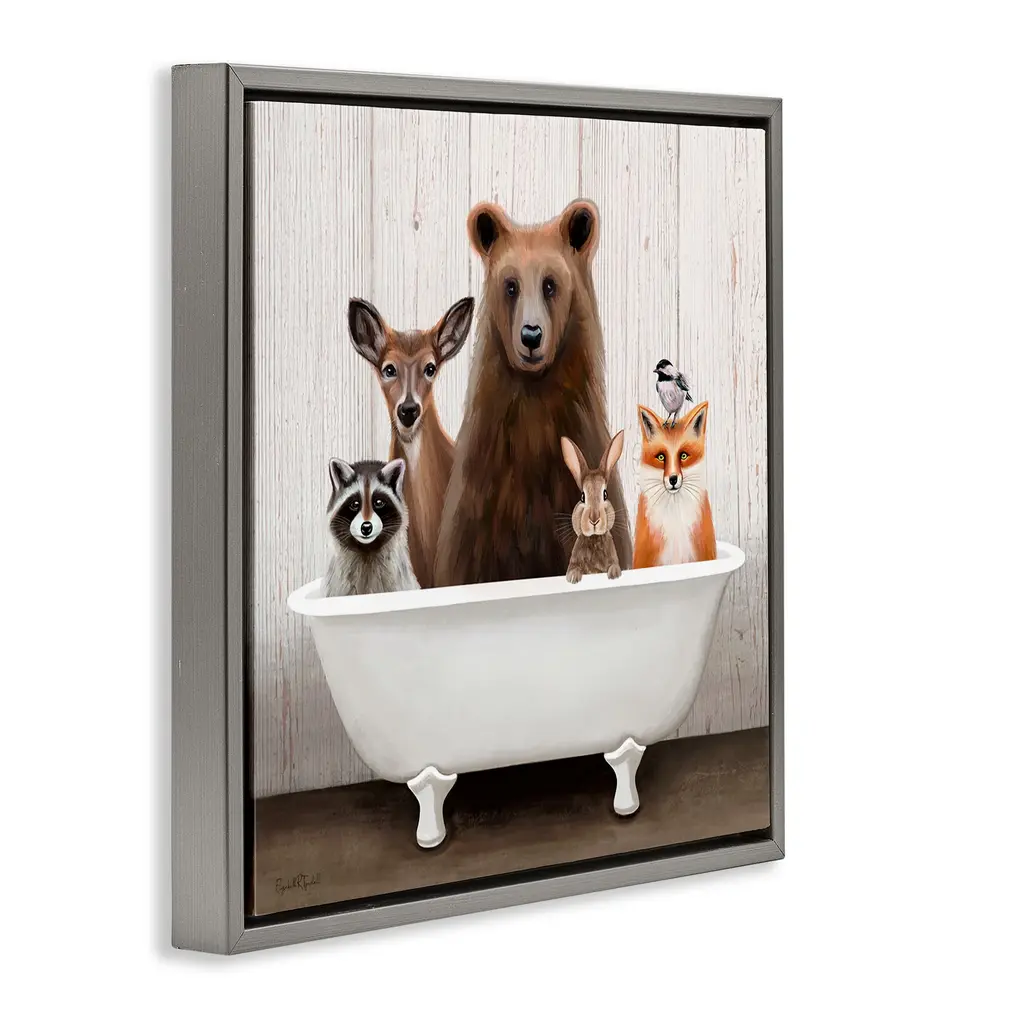 Elevate your home or office to the next level with Stupell Framed Floating Canvas Wall Art. Our premium hand-stretched canvas is mounted securely into a sturdy lightweight frame. The museum-style gap between the wrapped canvas and the box frame gives the illusion of floating artwork. Stupell Wall Art is made in the USA.Features: Dimensions: 18 x 1.7 x 18 Frame, 17 x 1.5 x 17 Canvas ArtFloating Frame Canvas Products are available in sizes 18"x18" and 25"x25". All Floating Frame Canvas Products have a 1.7" Depth.Wall Art is Ready to Hang with Hardware Free Hanging. No Installation required. For Easy Set Up Lean or Layer Artwork on Shelf or Against Wall. Artwork is Permently Fixed into the Frame.Our elevated 1.7" Thick Floating Frame is the perfect complement to our canvas style Wall Art. We use only the highest quality inks in house with industry leading printing solutions. Canvas is hand stretched over a durable wood foundation and then mounted securly into a Modern Box Frame. Made in the USA.Artwork Relates To: Tub, Bathtub, Mammal, Animal, Canine, Antelope, Wildlife, Bathroom, Raccoon, Deer, BearDesign by Elizabeth Tyndall