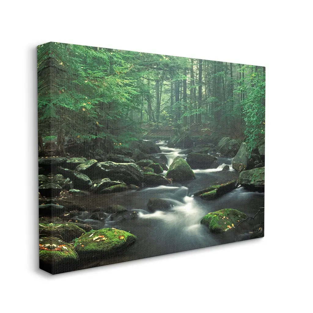 We create our stretched canvas to the highest standards. Using only the highest quality inks and canvas on Mimaki printers, we hand-cut and stretch each piece over a 1.5-inch thick wooden frame for hanging. As a result, the art comes ready to hang on the sturdy ledge with no installation required. Stupell Wall Art is made in the USA.Features: Dimensions: 20 x 1.5 x 16 InchesStretched Canvas Sizes Include Standard: 20 x 1.5 x 16 Large: 30 x 1.5 x 20 X-Large: 40 x 1.5 x 30 Oversized: 48 x 1.5 x 36Wall Art is Ready to Hang with Hardware Free Hanging. No installation required. For Easy Set Up Lean or Layer Artwork on Shelf or Against Wall.Our stretched canvas is created with the highest standards. We use only the highest quality inks and canvas on our in house Mimaki printers, and then hand cut and stretch each piece over a 1.5 inch thick wooden frame for hanging. Made In USA.Artwork Relates To: Nature, Stream, Water, Land, Plant, Rainforest, Tree, Vegetation, Creek, Scenery, Green, Woodland, Moss, Landscape, RockDesign by Patrick Zephyr