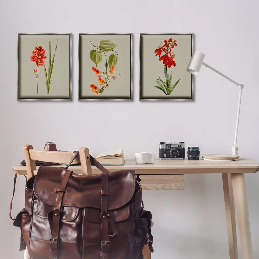 Elevate your home or office to the next level with Stupell Framed Floating Canvas Wall Art. Our premium hand-stretched canvas is mounted securely into a sturdy lightweight frame. The museum-style gap between the wrapped canvas and the box frame gives the illusion of floating artwork. Stupell Wall Art is made in the USA.Features: Dimensions: 3 Piece Set, Each Frame is 17 x 1.7 x 21Three Piece Floater Framed Canvas are available as 17x21 or 25x31 Panels. All Floater Frame Products have a 1.7" Depth.Wall Art is Ready to Hang with Hardware Free Hanging. No Installation required. For Easy Set Up Lean or Layer Artwork on Shelf or Against Wall. Artwork is Permently Fixed into the Frame.Our elevated 1.7" Thick Floating Frame is the perfect complement to our canvas style Wall Art. We use only the highest quality inks in house with industry leading printing solutions. Canvas is hand stretched over a durable wood foundation and then mounted securly into a Modern Box Frame. Made in the USA.Artwork Relates To: Flower, Plant, Anther, Floral, Petal, Botanical, Leaf, Vintage, StudyDesign by Vision Studio