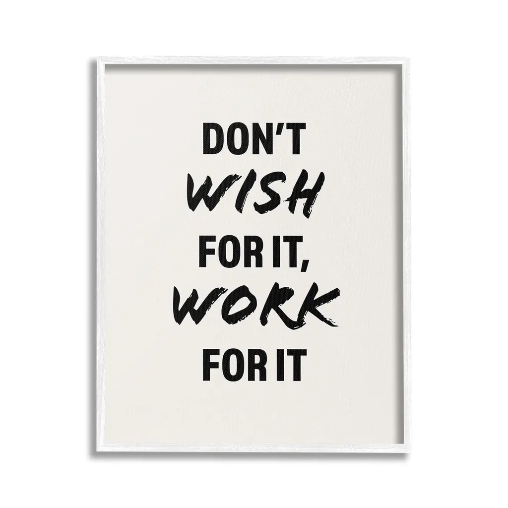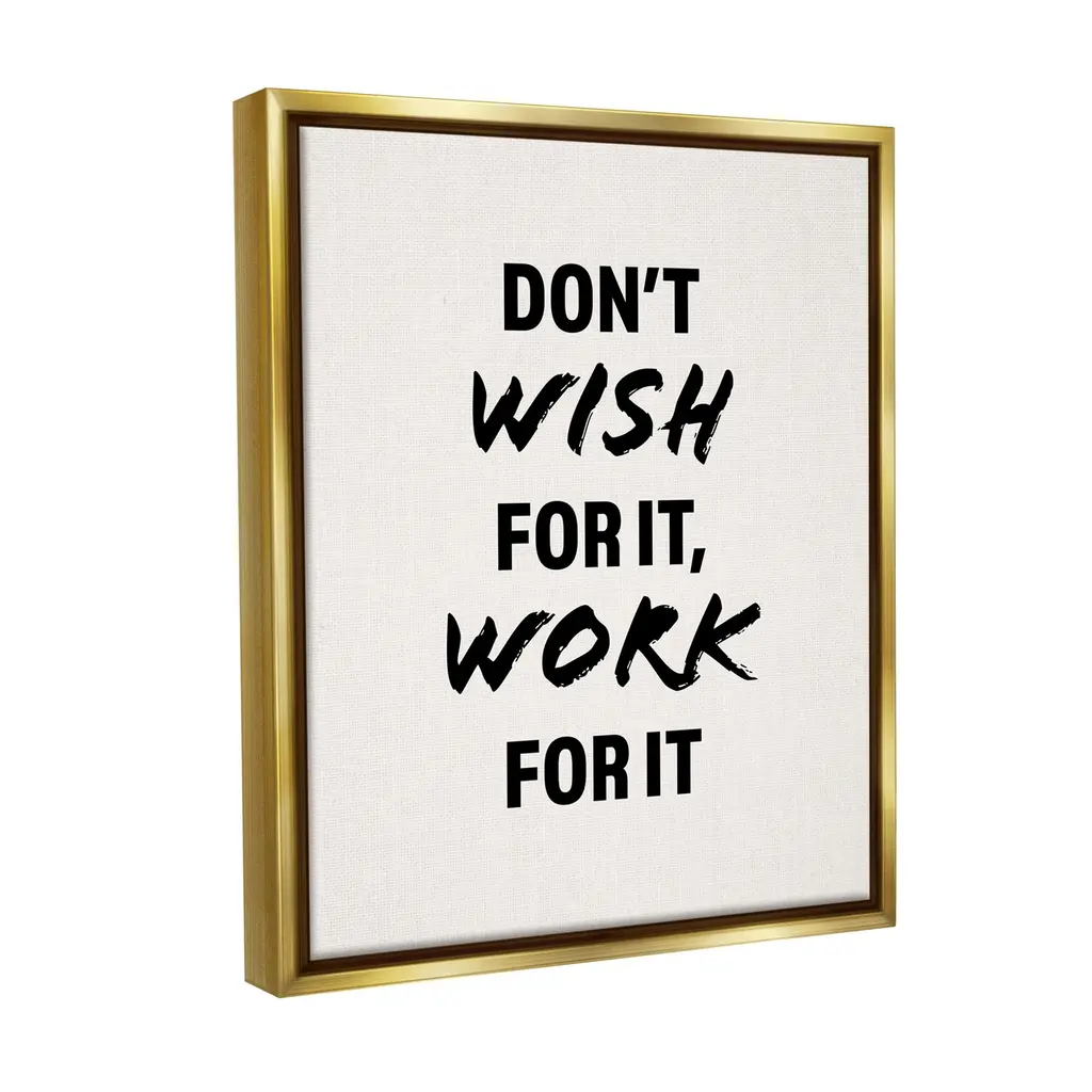 Elevate your home or office to the next level with Stupell Framed Floating Canvas Wall Art. Our premium hand-stretched canvas is mounted securely into a sturdy lightweight frame. The museum-style gap between the wrapped canvas and the box frame gives the illusion of floating artwork. Stupell Wall Art is made in the USA.Features: Dimensions: 17 x 1.7 x 21 Frame, 16 x 1.5 x 20 Canvas ArtFloating Frame Canvas Products are available in sizes 17"x21" and 25"x31". All Floating Frame Canvas Products have a 1.7" Depth.Wall Art is Ready to Hang with Hardware Free Hanging. No Installation required. For Easy Set Up Lean or Layer Artwork on Shelf or Against Wall. Artwork is Permently Fixed into the Frame.Our elevated 1.7" Thick Floating Frame is the perfect complement to our canvas style Wall Art. We use only the highest quality inks in house with industry leading printing solutions. Canvas is hand stretched over a durable wood foundation and then mounted securly into a Modern Box Frame. Made in the USA.Artwork Relates To: Inspirational, Motivational, Minimal, Don't Wish For It Work For itDesign by Victoria Barnes