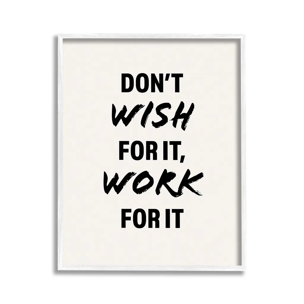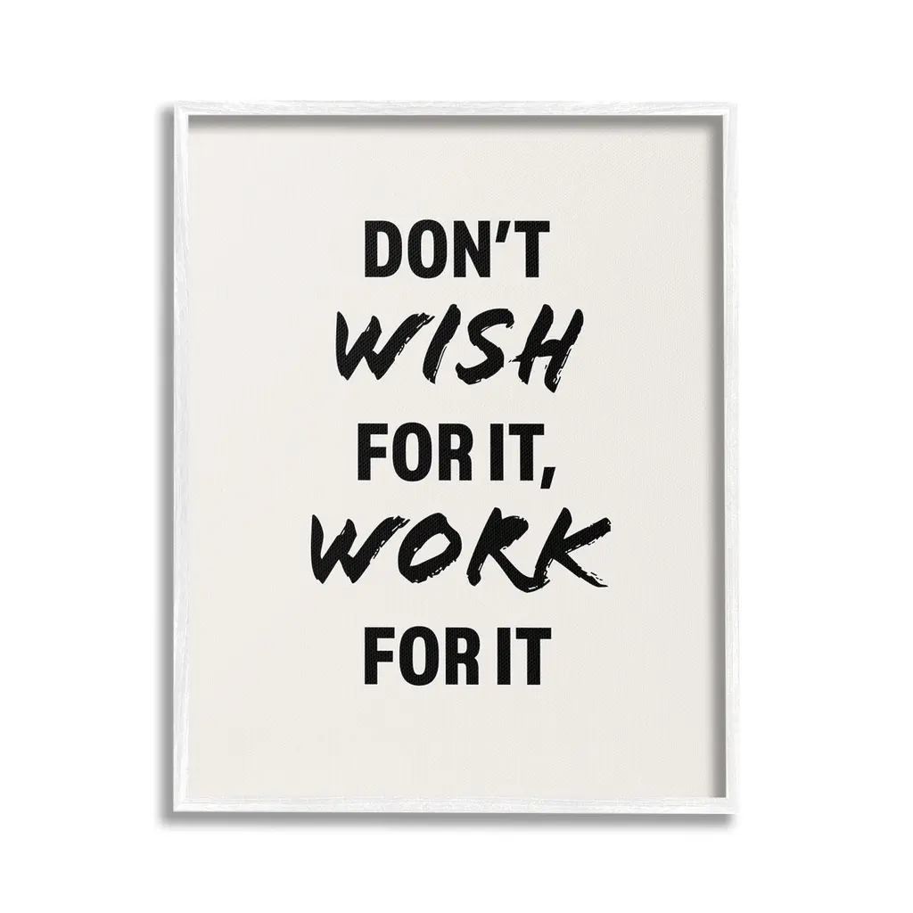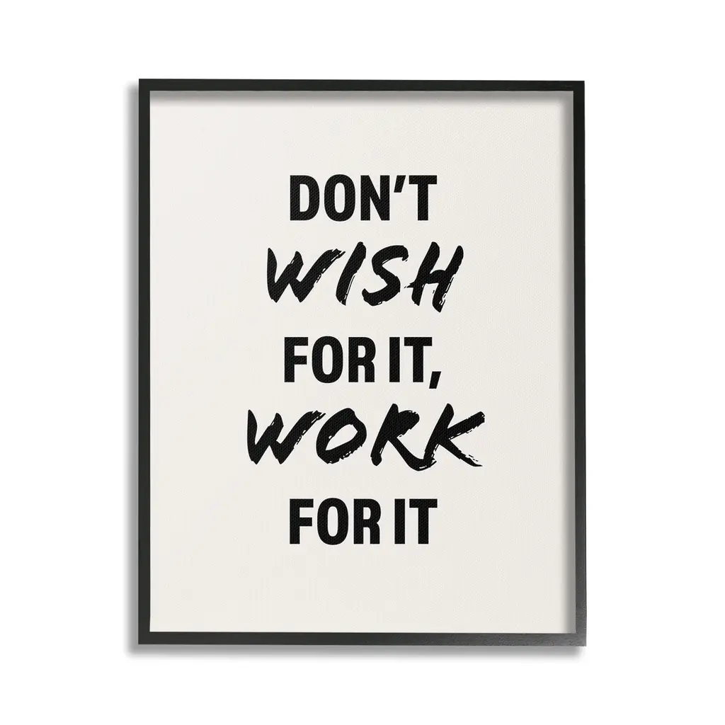 Add dimension to any room with our textured Framed Giclee Artwork. Our framed artwork is securely mounted into a 1.5-inch thick wood grain frame and ready to hang. Frames are available in three alluring styles: black, gray farmhouse and white. In addition, you should check out our oversized options if you want a statement piece. Stupell Wall Art is made in the USA.Features: Dimensions: 11 x 1.5 x 14 FramedFramed Giclee Products are available in the sizes 11"x14", 16"x20" or 24"x30". All Framed Giclee Products have a 1.5" Depth. Wall Art is Ready to Hang with Hardware Free Hanging. No installation required. For Easy Set Up Lean or Layer Artwork on Shelf or Against Wall.Our giclée prints are carefully mounted on a durable MDF backing, and then perfectly finished in a 1.5 inch thick woodgrain frame. Mounted frame colors include black, gray farmhouse and white. Made In USA.Artwork Relates To: Inspirational, Motivational, Minimal, Don't Wish For It Work For itDesign by Victoria Barnes