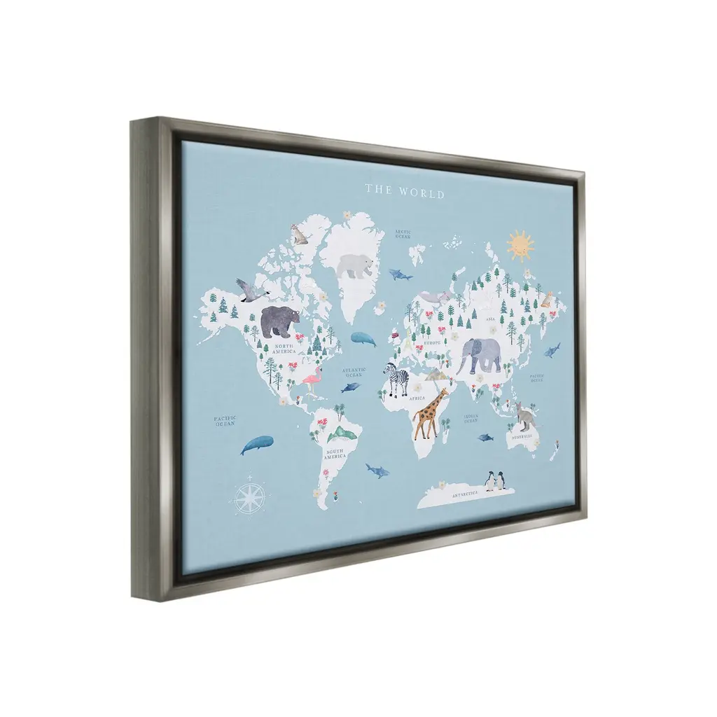 Elevate your home or office to the next level with Stupell Framed Floating Canvas Wall Art. Our premium hand-stretched canvas is mounted securely into a sturdy lightweight frame. The museum-style gap between the wrapped canvas and the box frame gives the illusion of floating artwork. Stupell Wall Art is made in the USA.Features: Dimensions: 21 x 1.7 x 17 Frame, 20 x 1.5 x 16 Canvas ArtFloating Frame Canvas Products are available in sizes 21"x17" and 31"x25". All Floating Frame Canvas Products have a 1.7" Depth.Wall Art is Ready to Hang with Hardware Free Hanging. No Installation required. For Easy Set Up Lean or Layer Artwork on Shelf or Against Wall. Artwork is Permently Fixed into the Frame.Our elevated 1.7" Thick Floating Frame is the perfect complement to our canvas style Wall Art. We use only the highest quality inks in house with industry leading printing solutions. Canvas is hand stretched over a durable wood foundation and then mounted securly into a Modern Box Frame. Made in the USA.Artwork Relates To: Animal, Bear, Mammal, Wildlife, Map, Diagram, Educational, World Map, Elephant, PenguinDesign by Leah Straatsma
