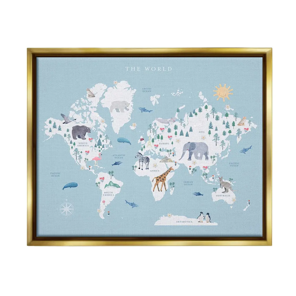 Elevate your home or office to the next level with Stupell Framed Floating Canvas Wall Art. Our premium hand-stretched canvas is mounted securely into a sturdy lightweight frame. The museum-style gap between the wrapped canvas and the box frame gives the illusion of floating artwork. Stupell Wall Art is made in the USA.Features: Dimensions: 21 x 1.7 x 17 Frame, 20 x 1.5 x 16 Canvas ArtFloating Frame Canvas Products are available in sizes 21"x17" and 31"x25". All Floating Frame Canvas Products have a 1.7" Depth.Wall Art is Ready to Hang with Hardware Free Hanging. No Installation required. For Easy Set Up Lean or Layer Artwork on Shelf or Against Wall. Artwork is Permently Fixed into the Frame.Our elevated 1.7" Thick Floating Frame is the perfect complement to our canvas style Wall Art. We use only the highest quality inks in house with industry leading printing solutions. Canvas is hand stretched over a durable wood foundation and then mounted securly into a Modern Box Frame. Made in the USA.Artwork Relates To: Animal, Bear, Mammal, Wildlife, Map, Diagram, Educational, World Map, Elephant, PenguinDesign by Leah Straatsma