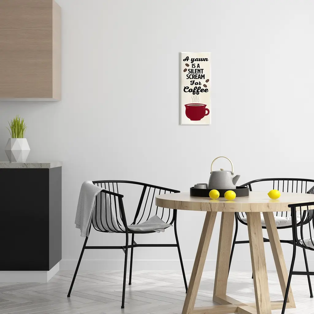 Our wall plaques start as high-quality lithograph prints mounted on durable 0.5-inch thick MDF wood. Each piece is hand finished and comes with a fresh layer of white foil on the sides to give it a crisp, clean look. Plaques arrive ready to hang without installation and come with removable plastic corners to keep them from damage in transit. Stupell Wall Art is made in the USA.Features: Dimensions: 7 x 0.5 x 17 InchesWall Art is Ready to Hang with Hardware Free Hanging. No installation required. For Easy Set Up Lean or Layer Artwork on Shelf or Against Wall.All of our wall plaques start off as high quality lithograph prints that are then mounted on durable 0.5 inch thick MDF wood. Each piece is hand finished and comes with a fresh layer of foil on the sides to give it a crisp clean look. Made In USA.Artwork Relates To: Cup, Beverage, Coffee, Coffee Cup, Mug, Kitchen, A Yawn is a Silent Scream for CoffeeDesign by Kim Allen