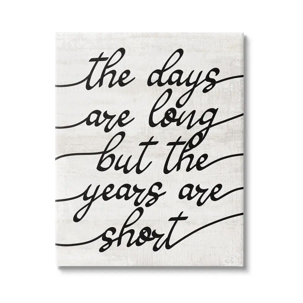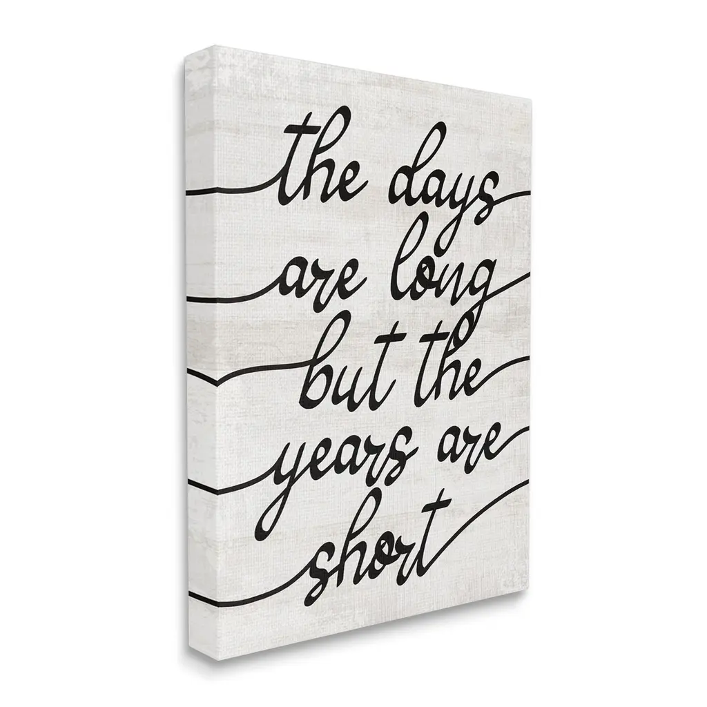 We create our stretched canvas to the highest standards. Using only the highest quality inks and canvas on Mimaki printers, we hand-cut and stretch each piece over a 1.5-inch thick wooden frame for hanging. As a result, the art comes ready to hang on the sturdy ledge with no installation required. Stupell Wall Art is made in the USA.Features: Dimensions: 16 x 1.5 x 20 InchesStretched Canvas Sizes Include Standard: 16 x 1.5 x 20 Large: 20 x 1.5 x 30 X-Large: 30 x 1.5 x 40 Oversized: 36 x 1.5 x 48Wall Art is Ready to Hang with Hardware Free Hanging. No installation required. For Easy Set Up Lean or Layer Artwork on Shelf or Against Wall.Our stretched canvas is created with the highest standards. We use only the highest quality inks and canvas on our in house Mimaki printers, and then hand cut and stretch each piece over a 1.5 inch thick wooden frame for hanging. Made In USA.Artwork Relates To: Phrase, Rustic, The Days Are Long But The Years Are ShortDesign by Lil' Rue