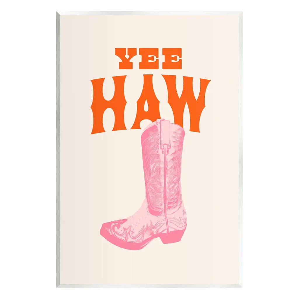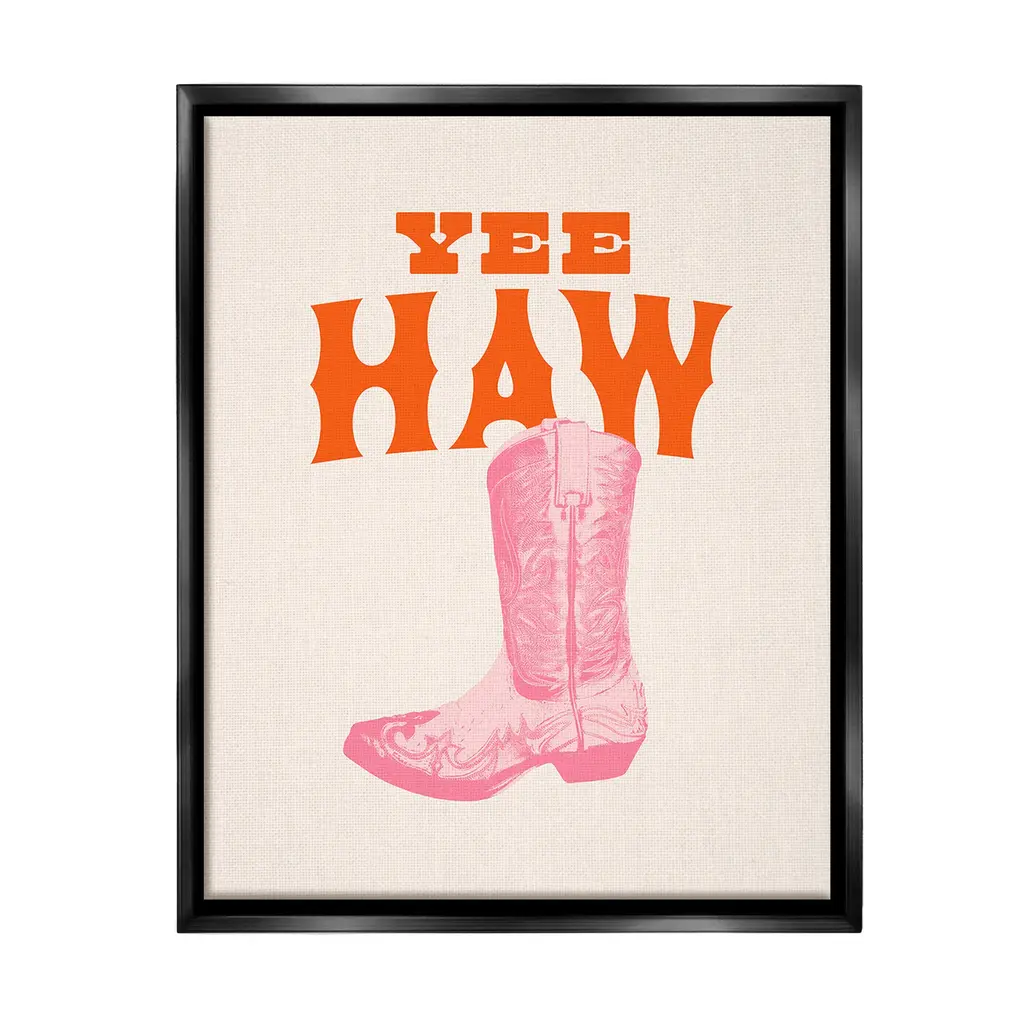 Elevate your home or office to the next level with Stupell Framed Floating Canvas Wall Art. Our premium hand-stretched canvas is mounted securely into a sturdy lightweight frame. The museum-style gap between the wrapped canvas and the box frame gives the illusion of floating artwork. Stupell Wall Art is made in the USA.Features: Dimensions: 17 x 1.7 x 21 Frame, 16 x 1.5 x 20 Canvas ArtFloating Frame Canvas Products are available in sizes 17"x21" and 25"x31". All Floating Frame Canvas Products have a 1.7" Depth.Wall Art is Ready to Hang with Hardware Free Hanging. No Installation required. For Easy Set Up Lean or Layer Artwork on Shelf or Against Wall. Artwork is Permently Fixed into the Frame.Our elevated 1.7" Thick Floating Frame is the perfect complement to our canvas style Wall Art. We use only the highest quality inks in house with industry leading printing solutions. Canvas is hand stretched over a durable wood foundation and then mounted securly into a Modern Box Frame. Made in the USA.Artwork Relates To: Animal, Horse, Mammal, Saddle, Equestrian, Rodeo, Country, Southwestern, Cowboy, Cowgirl, Phrase, Humor, Cowboy Boot, Yee HawDesign by Victoria Barnes
