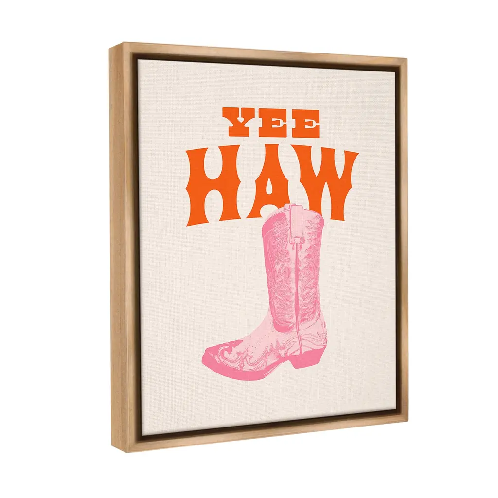 Elevate your home or office to the next level with Stupell Framed Floating Canvas Wall Art. Our premium hand-stretched canvas is mounted securely into a sturdy lightweight frame. The museum-style gap between the wrapped canvas and the box frame gives the illusion of floating artwork. Stupell Wall Art is made in the USA.Features: Dimensions: 17 x 1.7 x 21 Frame, 16 x 1.5 x 20 Canvas ArtFloating Frame Canvas Products are available in sizes 17"x21" and 25"x31". All Floating Frame Canvas Products have a 1.7" Depth.Wall Art is Ready to Hang with Hardware Free Hanging. No Installation required. For Easy Set Up Lean or Layer Artwork on Shelf or Against Wall. Artwork is Permently Fixed into the Frame.Our elevated 1.7" Thick Floating Frame is the perfect complement to our canvas style Wall Art. We use only the highest quality inks in house with industry leading printing solutions. Canvas is hand stretched over a durable wood foundation and then mounted securly into a Modern Box Frame. Made in the USA.Artwork Relates To: Animal, Horse, Mammal, Saddle, Equestrian, Rodeo, Country, Southwestern, Cowboy, Cowgirl, Phrase, Humor, Cowboy Boot, Yee HawDesign by Victoria Barnes