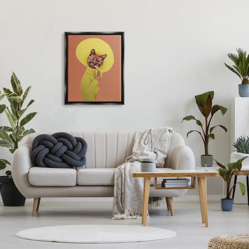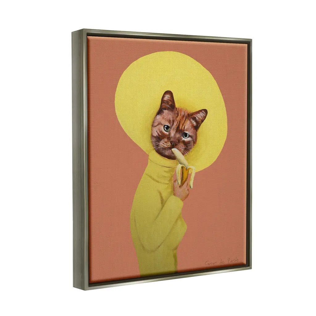 Elevate your home or office to the next level with Stupell Framed Floating Canvas Wall Art. Our premium hand-stretched canvas is mounted securely into a sturdy lightweight frame. The museum-style gap between the wrapped canvas and the box frame gives the illusion of floating artwork. Stupell Wall Art is made in the USA.Features: Dimensions: 17 x 1.7 x 21 Frame, 16 x 1.5 x 20 Canvas ArtFloating Frame Sizes Include Standard: 17 x 1.7 x 21 Oversized: 25 x 1.7 x 31Wall Art is Ready to Hang - No Installation or Hardware Needed. For Easy Set Up Lean or Layer Artwork on Shelf or Against Wall.Our elevated 1.7" Thick Floating Frame is the perfect complement to our canvas style Wall Art. We use only the highest quality inks in house with industry leading printing solutions. Canvas is hand stretched over a durable wood foundation and then mounted securly into a Modern Box Frame. Made in the USA.Artwork Relates To: Modern, Painting, Animal, Mammal, Cat, Yellow, Funny, BananaDesign by Coco de Paris