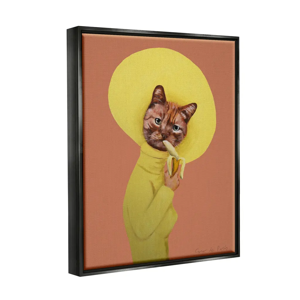 Elevate your home or office to the next level with Stupell Framed Floating Canvas Wall Art. Our premium hand-stretched canvas is mounted securely into a sturdy lightweight frame. The museum-style gap between the wrapped canvas and the box frame gives the illusion of floating artwork. Stupell Wall Art is made in the USA.Features: Dimensions: 17 x 1.7 x 21 Frame, 16 x 1.5 x 20 Canvas ArtFloating Frame Sizes Include Standard: 17 x 1.7 x 21 Oversized: 25 x 1.7 x 31Wall Art is Ready to Hang - No Installation or Hardware Needed. For Easy Set Up Lean or Layer Artwork on Shelf or Against Wall.Our elevated 1.7" Thick Floating Frame is the perfect complement to our canvas style Wall Art. We use only the highest quality inks in house with industry leading printing solutions. Canvas is hand stretched over a durable wood foundation and then mounted securly into a Modern Box Frame. Made in the USA.Artwork Relates To: Modern, Painting, Animal, Mammal, Cat, Yellow, Funny, BananaDesign by Coco de Paris