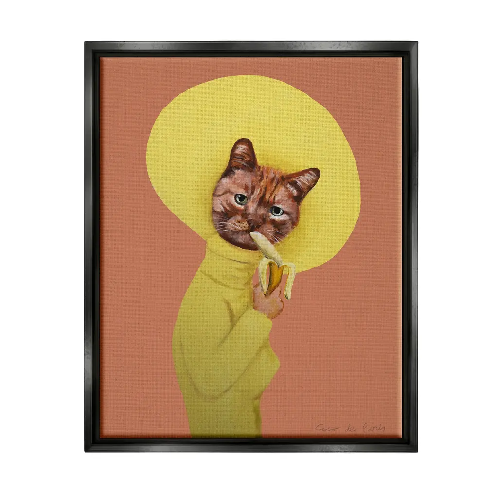 Elevate your home or office to the next level with Stupell Framed Floating Canvas Wall Art. Our premium hand-stretched canvas is mounted securely into a sturdy lightweight frame. The museum-style gap between the wrapped canvas and the box frame gives the illusion of floating artwork. Stupell Wall Art is made in the USA.Features: Dimensions: 17 x 1.7 x 21 Frame, 16 x 1.5 x 20 Canvas ArtFloating Frame Sizes Include Standard: 17 x 1.7 x 21 Oversized: 25 x 1.7 x 31Wall Art is Ready to Hang - No Installation or Hardware Needed. For Easy Set Up Lean or Layer Artwork on Shelf or Against Wall.Our elevated 1.7" Thick Floating Frame is the perfect complement to our canvas style Wall Art. We use only the highest quality inks in house with industry leading printing solutions. Canvas is hand stretched over a durable wood foundation and then mounted securly into a Modern Box Frame. Made in the USA.Artwork Relates To: Modern, Painting, Animal, Mammal, Cat, Yellow, Funny, BananaDesign by Coco de Paris