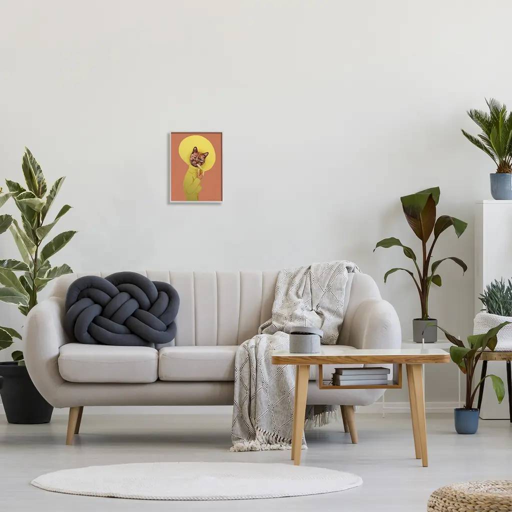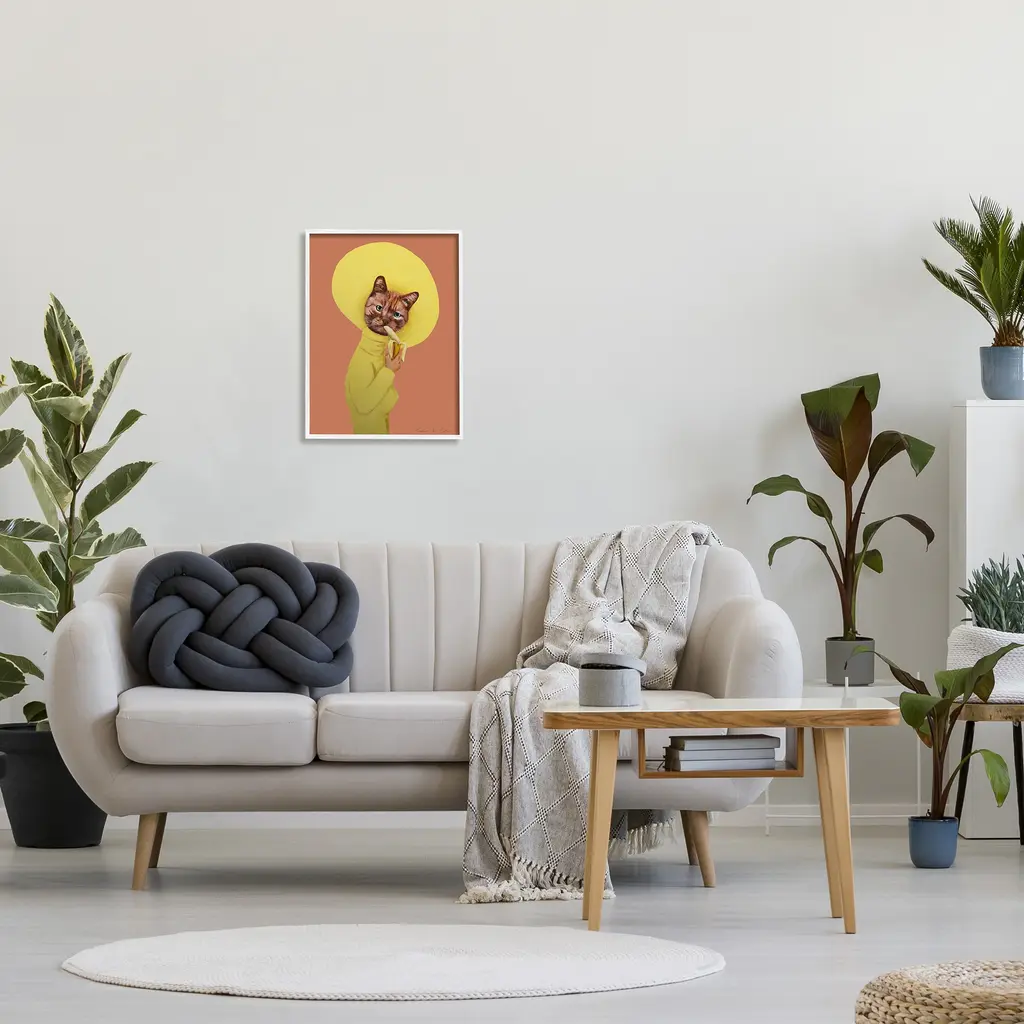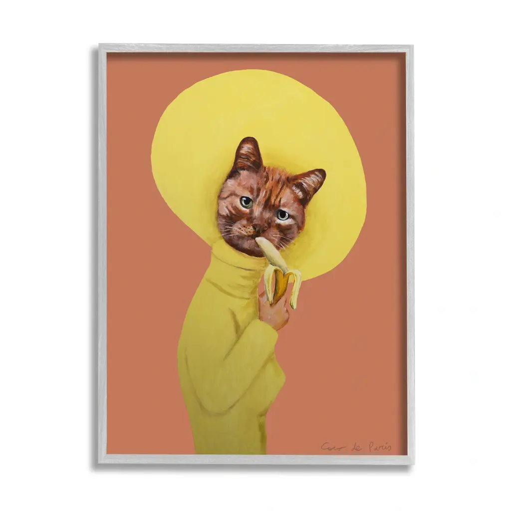Add dimension to any room with our textured Framed Giclee Artwork. Our framed artwork is securely mounted into a 1.5-inch thick wood grain frame and ready to hang. Frames are available in three alluring styles: black, gray farmhouse and white. In addition, you should check out our oversized options if you want a statement piece. Stupell Wall Art is made in the USA.Features: Dimensions: 11 x 1.5 x 14 FramedFramed Giclee Sizes Include Standard: 11 x 1.5 x 14 Large: 16 x 1.5 x 20 Oversized: 24 x 1.5 x 30Wall Art is Ready to Hang - No Installation or Hardware Needed. For Easy Set Up Lean or Layer Artwork on Shelf or Against Wall.Our giclée prints are carefully mounted on a durable MDF backing, and then perfectly finished in a 1.5 inch thick woodgrain frame. Mounted frame colors include black, gray farmhouse and white. Made In USA.Artwork Relates To: Modern, Painting, Animal, Mammal, Cat, Yellow, Funny, BananaDesign by Coco de Paris
