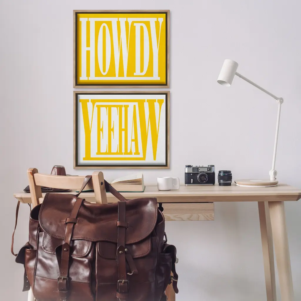 Elevate your home or office to the next level with Stupell Framed Floating Canvas Wall Art. Our premium hand-stretched canvas is mounted securely into a sturdy lightweight frame. The museum-style gap between the wrapped canvas and the box frame gives the illusion of floating artwork. Stupell Wall Art is made in the USA.Features: Dimensions: 2 Piece Set, Each Frame is 17 x 1.7 x 21Two Piece Floater Framed Canvas are available as 21"x17" or 31"x24" Panels. All Floater Frame Products have a 1.7" Depth.Wall Art is Ready to Hang with Hardware Free Hanging. No Installation required. For Easy Set Up Lean or Layer Artwork on Shelf or Against Wall. Artwork is Permently Fixed into the Frame.Our elevated 1.7" Thick Floating Frame is the perfect complement to our canvas style Wall Art. We use only the highest quality inks in house with industry leading printing solutions. Canvas is hand stretched over a durable wood foundation and then mounted securly into a Modern Box Frame. Made in the USA.Artwork Relates To: Typography, Phrase, Southwestern, Cowboy, Cowgirl, Southern, Country, Howdy, YeehawDesign by Grace Popp