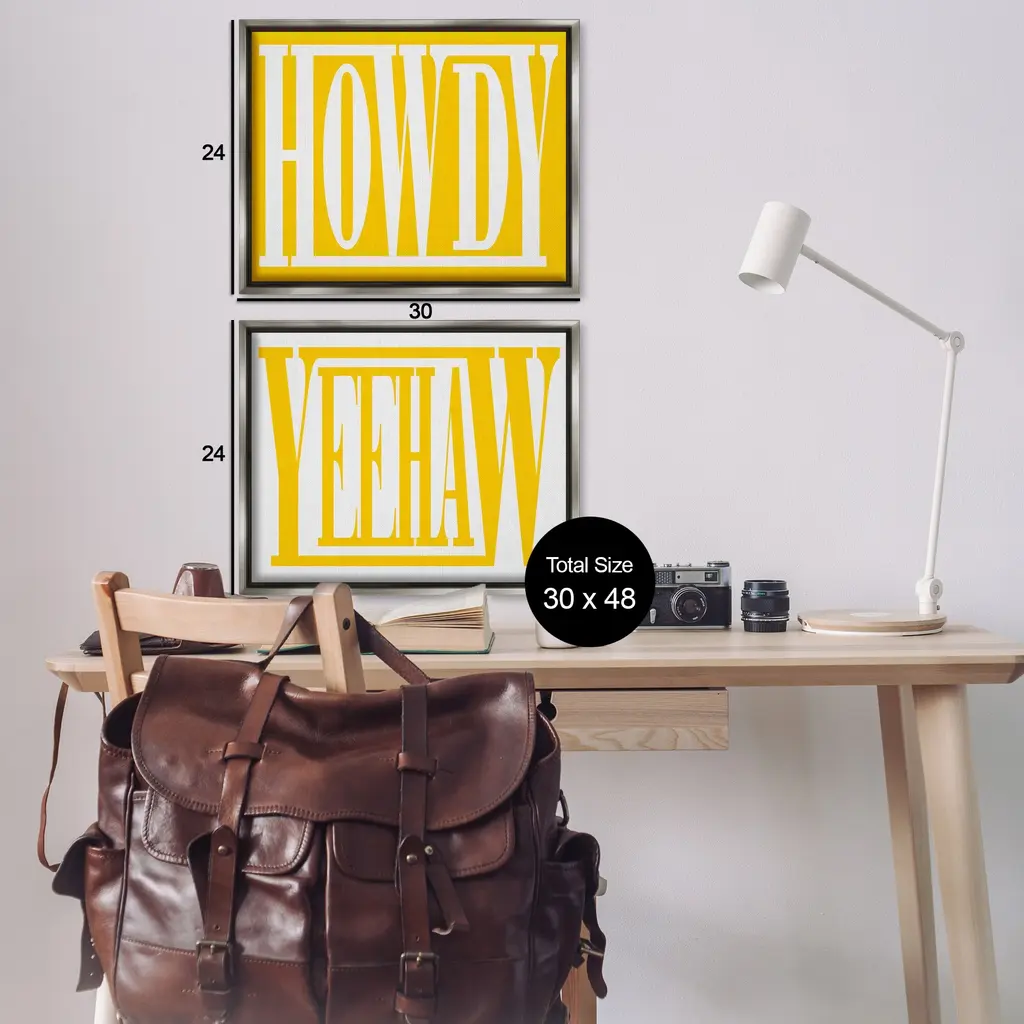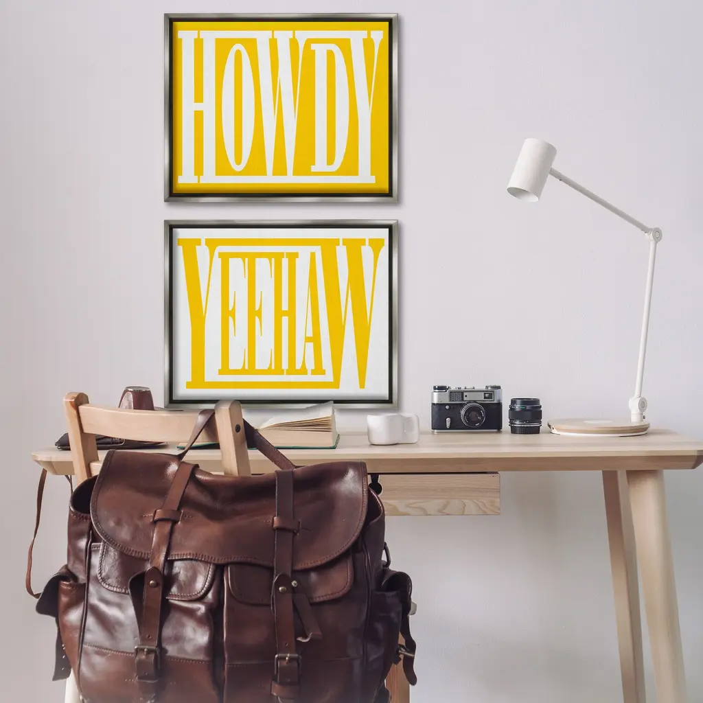 Elevate your home or office to the next level with Stupell Framed Floating Canvas Wall Art. Our premium hand-stretched canvas is mounted securely into a sturdy lightweight frame. The museum-style gap between the wrapped canvas and the box frame gives the illusion of floating artwork. Stupell Wall Art is made in the USA.Features: Dimensions: 2 Piece Set, Each Frame is 17 x 1.7 x 21Two Piece Floater Framed Canvas are available as 21"x17" or 31"x24" Panels. All Floater Frame Products have a 1.7" Depth.Wall Art is Ready to Hang with Hardware Free Hanging. No Installation required. For Easy Set Up Lean or Layer Artwork on Shelf or Against Wall. Artwork is Permently Fixed into the Frame.Our elevated 1.7" Thick Floating Frame is the perfect complement to our canvas style Wall Art. We use only the highest quality inks in house with industry leading printing solutions. Canvas is hand stretched over a durable wood foundation and then mounted securly into a Modern Box Frame. Made in the USA.Artwork Relates To: Typography, Phrase, Southwestern, Cowboy, Cowgirl, Southern, Country, Howdy, YeehawDesign by Grace Popp
